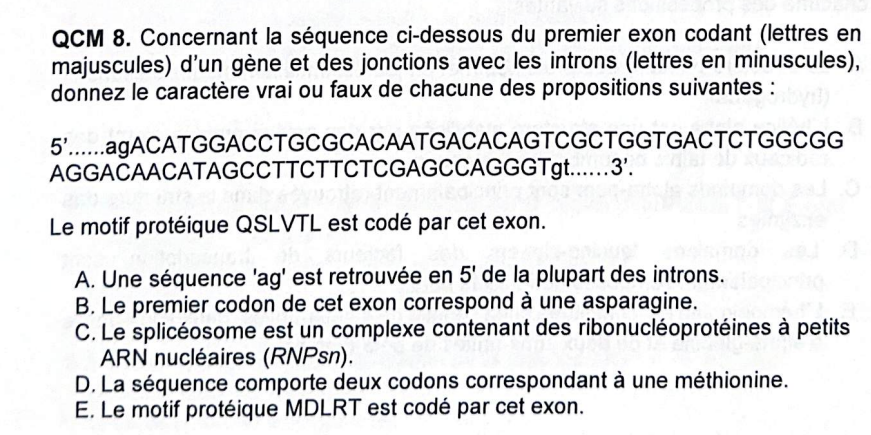 Salut, dans ce genre de qcm, tu dois trouver le premier codon ATG qui va te donner le cadre de lecture qui est super important ! Puis à partir de lui, tu vas compter de trois en trois et normalement tu vas tomber sur le codon qui code pour Q dont tu parle, et qui marquera le début de la séquence protéique. Mais ce n'est pas forcément le premier codon de l'ARNm. J'espère avoir répondu à ta question !