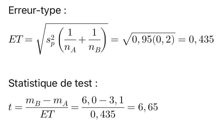 Salut ! Je dirais que cet item est vrai Car d’après le tableau, on voit que la différence entre les deux moyennes est de 2,9 (6-3,1). L’hypothèse alternative indique une valeur seuil de 2,101. Il faut calculer la statistique de test en divisant la différence des deux moyennes (2,9) par l’erreur type : La statistique de test est de 6,65 >>2,101 (La valeur seuil qui nous est donnée). Le traitement B donne un sommeil significativement plus long. Nous pouvons donc conclure qu’il existe une différence significative entre ces deux moyennes, et donc les durées moyennes de sommeil dans la population selon le traitement pris. J’espère avoir répondu à ta question ! Bon courage ! :)0 points -