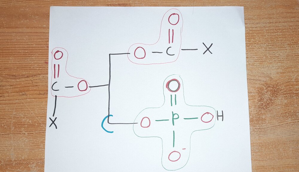 Salut salut, Tout d'abord, on te demandera pas pourquoi c'est numéroté comme ça et surtout pas en biochimie (en chimie peut-être mais vu que vous avez pas vu les liaisons phosphodiesters ça m'étonnerais). Ce qui te pose problème (dis moi si j'ai tort), c'est qu'on a 2 liaisons esters et une liaison phosphodiester. Sauf que la liaison phosphodiester est sur un phosphore, or on doit commencer par un carbone. Le carbone le plus proche du phosphore ne portant pas la liaison, il n'est pas prioritaire sur les carbones portants une fonction ester. Sur le schéma si dessous (vu que t'en a demandé un), j'ai dessiné un phospholipide. J'ai ensuite entouré les liaisons (ester en rouge et phosphodiester en vert). On voit clairement que le carbone du bas ne participe pas à la fonction phosphodiester ! Bon courage pour tes révisions mon rayon de miel0 points -