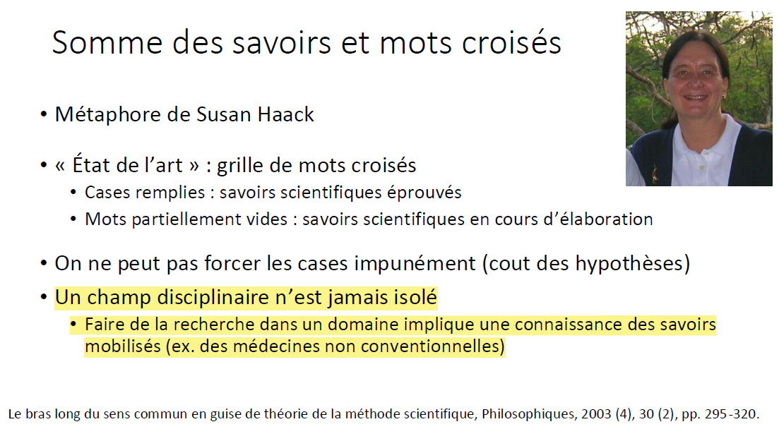 Salut ! Effectivement, le fait que l'observation soit dépendante de la théorie est un problème de l'induction. Cependant, il serait difficile de s'affranchir totalement de la théorie pour formuler une hypothèse. En effet, pour évoluer en sciences, il faut des connaissance théoriques qui permettent ensuite de faire de la recherche. Bien que les connaissances théoriques puissent être fausses il faut se baser sur ces dernières pour chercher. Aussi, lorsque on propose un énoncé d'observation, il doit toujours s'intégrer dans un cadre théorique (cela permet de voir sur quels présupposés théoriques on s'appuie). Le QCM, fait référence aux "outils épistémologiques", la théorie de Susan Haack "Somme des savoirs et mots croisés" en fait parti. Dans le cadre de cette théorie, on voit bien (phrase surlignée) que pour faire de la recherche il faut avoir des connaissance approfondies sur notre domaine de recherche (c'est un cadre théorique). En espérant t'avoir aidé, Bon courage !!0 points -