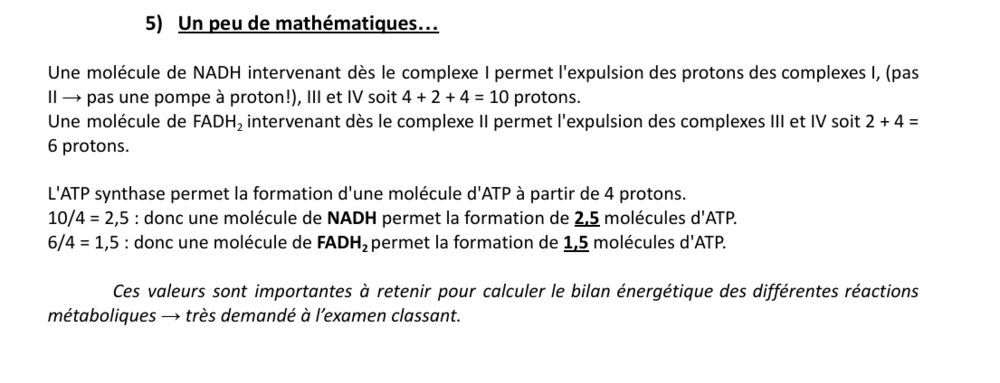 Salut salut, J'aimerais compléter la réponse de @noidonthaveagun parce que j'ai une autre interprétation de ta question. Tu n'as pas totalement tort en doutant de cet item. En chimie, la mole est une unité qui permet de quantifier la matière en petits paquets de 6,022 x 1023 entités élémentaires (qui peuvent être des atomes ou des molécules). Sauf que là on est en biochimie donc on peut s'en servir pour quantifier un produit, une enzyme ou un substrat. Donc, en chimie, une molécule n'est pas égale à une mole mais en biochimie tu peux considérer que si. Il aurait effectivement été plus rigoureux d'écrire "L'oxydation totale d'une molécule de NADH, H+ permet la synthèse de 2,5 molécules d'AТР" ou bien "L'oxydation totale d'une mole de NADH, H+ permet la synthèse de 2,5 moles d'AТР". Concernant ta remise en question, je te conseille d'attendre les vacances parce que c'est pas trop la priorité pour l'instant. Je te souhaite un bon courage pour tes révisions ma choupinette.0 points -