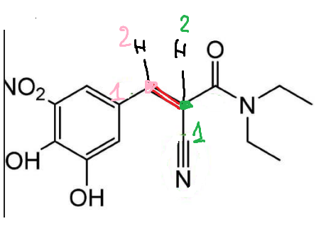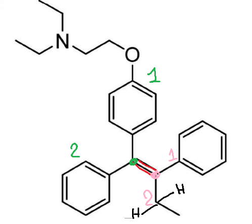Alors on fait pareil au niveau de la double liaison : on classe les 2 groupements liés à chacun des carbones impliqués dans la double liaison (C rose et C vert) Puis on compare la position des deux groupements avec le même indice de numérotation. Si ils sont du même côté -> configuration Z Si ils sont à l'opposé l'un de l'autre -> configuration E Ici on est sur un Z (les deux n°2 en haut et les deux n°1 en bas) Pour le deuxième c'est pareil Du côté du C rose on a un cycle et un éthyle. Donc du côté du cycle le C est lié à 2 autres C avec une liaison simple vers le haut et une double liaison vers le bas. Tandis que l'autre C lié au C rose est lié à deux H et un autre C. Le cycle est donc n°1 et l'éhtyle n°2 Du côté du C vert on a le même cycle en haut et en bas, on va donc chercher plus loin. Le cycle du haut est lié à un O (éther-oxyde) donc le cycle du haut est n°1 et celui du bas n°2 Ici on a aussi un Z (les deux n°2 en bas et les deux n°1 en haut) J'espère que c'est plus claire, il ne faut pas se laisser impressionner par la taille des molécules ou la présence de cycle. N'hésite pas si tu as d'autres questions !!0 points -