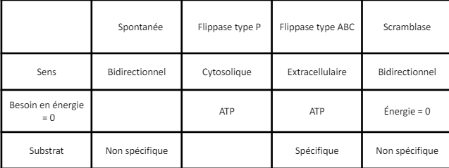 Solution Juju_turtle Posted March 5, 2024 Solution Posted March 5, 2024 Coucou @catarinamm Si on regarde la structure de la membrane plasmique, on remarque qu'il y a une répartition asymétrique des phospholipides à la membrane avec sur le feuillet interne majoritairement des phosphatidylsérines ( PS), des phosphatidylinositols (PI) et des phosphatidyléthanolamines (PE). Sur le versant externe, on retrouve en majorité des phosphatidylcholines (PC) et des sphingolipides (SP). On a besoin d'enzymes qui vont permettre de bouger des phospholipides d'un endroit à un autre pour maintenir l'asymétrie. Parfois des modifications de cette organisation sont nécessaires pour déclencher certains phénomènes. - La flippase de type P va permettre d'amener des phospholipides spécifiquement les PS et +/- les PE sur le versant cytosolique donc sur le feuillet interne et pour cela, elle a besoin d'énergie et donc d'utiliser l'ATP. - Comme c'est écrit, le mécanisme spontané n'a pas besoin d'énergie et amène les phospholipides à la fois sur le feuillet externe et interne. - La flippase de type ABC va permettre d'amener les phospholipides spécifiquement les PC et SP sur le versant externe et pour cela elle a besoin d'énergie donc d'ATP. - La scramblase va permettre de transférer différents types de lipides (glycolipides, phospholipides) des deux côtés de la membranes, de manière non sélective et sans consommation d'énergie. Pour te donner un exemple de modification de la répartition en lien avec un phénomène cellulaire : Lorsque des PS apparaissent sur le feuillet externe, c'est le signe d'apoptose des cellules hématopoïétiques. On va donc avoir une diminution des flippase de type P (pour les empêcher d'amener les PS sur le versant interne) et une augmentation des scramblases (pour amener les PS sur le versant externe). Est-ce que c'est plus clair ? Quote