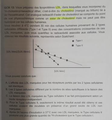 Ancien Responsable Matière Solution ElCassoulet Posted March 16, 2024 Ancien Responsable Matière Solution Posted March 16, 2024 Bonjour @juliette.botrel, avec ce genre de représentation graphique, il faut comprendre que l'on regarde en fait la liaison d'un ligand pour sont récepteur. Il faut aussi savoir qu'à 4°C, on considèrera que les protéines, enzymes etc... n'ont plus d'activité mais peuvent tout de même lier des ligands. A. Dans la mesure où les droites ne sont pas les mêmes, et avec ce que j'ai marqué juste au dessus; cela signifie que l'affinité des LDL pour ce qui est ici la cible est différentes entre les 2 types cellulaires que l'on regarde. B. Ici c'est nécessairement vrai, on regarde une liaison liée à la présence de récepteurs; une différence dans l'allure des droites s'explique ici par une différence dans la quantité de récepteurs présents à la surface de la cellule. C. La représentation utilisée ici ne donne pas d'information sur la liaison non-spécifique (pas liée à un récepteur), donc on ne peut pas conclure et l'item est alors faux, d'autant plus qu'ici, on n'a pas réaliser de condition qui nous permettrait de conclure sur cette liaison non-spécifique. D. Si on met un excès de LDL non-marqués, on ne les verra pas directement sur nos résultats, on ne pourra observer que la conséquence de leurs présences sur les LDL marqués. En ajoutant un excès de LDL non-marqués, ces derniers vont saturer les récepteurs et donc empêcher la liaison spécifique. E. À 37°C, les protéines retrouvent leur activité, ce qu'il faut comprendre ici, c'est que les récepteurs aux LDL vont pouvoir à nouveau faire rentrer les LDL qui n'étaient jusqu'alors que liés à la surface de la cellule. Ici, sa reste une question piégeuse dans le sens où la réponse se trouve en fait simplement dans l'énoncé : "Cet analogue radioactif d'ester de cholestérol se comporte du point de vue physicochimique comme un ester de cholestérol mais ne peut pas être hydrolysé par les cellules humaines." Donc finalement, aucune cellule ne sera capable d'avoir de cholestérol radioactif libre (non-estérifié) car celui-ci est inaccessible, impossible à hydrolyser pour la cellule. Tu comprends ? Quote
