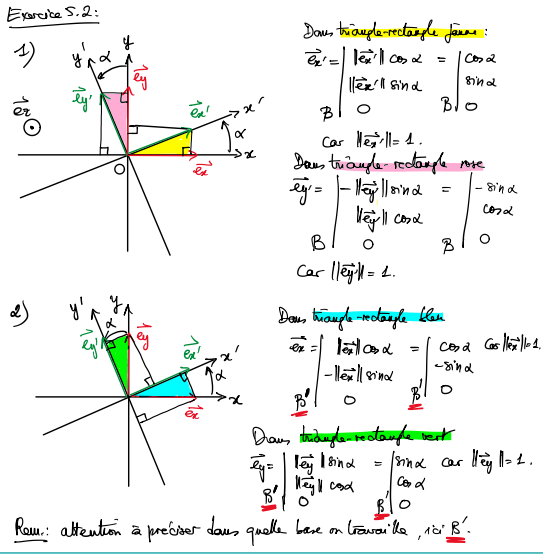 Jonathan Posted March 19, 2024 Posted March 19, 2024 Les coordonnées vectorielles d'un vecteur v dans une base (i, j, k) sont les coefficients scalaires (vx, vy, vz) de la combinaison linéaire unique des vecteurs de la base, égale au vecteur v: v = vx i + vy j + vz k (il manque les flèches au dessus des vecteurs v, i, j, k). Pour trouver dans la base orthonormée (ex, ey) les coordonnées de ex' et ey', rotation de la base (ex, ey), on cherche une combinaison linéaire de ex et de ey. Pour ey' on cherche les coefficients scalaires (exx, exy) tels que: ey' = eyx ex + eyy ey Lorsque l'angle α est petit et positif comme sur le schéma, on voit que eyy ey est le vecteur correspondant au grand côté du triangle rectangle rose et allant vers le haut, de même sens que ey, eyy = cos(α), et eyx ex est le vecteur correspondant au petit côté horizontal du triangle rectangle rose et allant vers la gauche, de sens opposé à ex, eyx = -sin(α). Note que comme on parle de bases orthonormées, tous les vecteurs considérés ont pour norme 1, donc ton r = 1. Raisonnement plus "matheux": on fait le produit scalaire . par ey puis par ex, de la relation ey' = eyx ex + eyy ey: ey'.ey = (eyx ex + eyy ey).ey = eyx ex.ey + eyy ey.ey = eyy (tous les vecteurs sont de norme 1, ex.ey = 0 et ey.ey = 1) ey'.ey = cos(α) = eyy ey'.ex = (eyx ex + eyy ey).ex = eyx ex.ex + eyy ey.ex = eyx (tous les vecteurs sont de norme 1, ex.ex = 1 et ey.ex = 0) ey'.ex = cos(α+π/2) = -sin(α) = eyx Quote