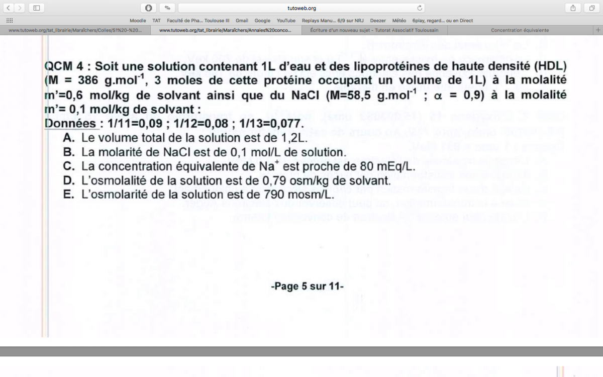 Solution Bayou Posted September 14, 2016 Solution Posted September 14, 2016 Salut, Je vais te faire la correction totale de l’exercice. Au début, essaie de faire les questions suivantes à partir du résultat de la A. A. On te dit que la molalité est égale à 0,6 mol/kg de solvant. Comme le solvant est de l’eau, un kg de solvant correspond à un litre d’eau. Cela revient à dire que la molarité est de 0,6 mol/L, tu as donc 0,6 mol puisque ta solution contient 1 L d’eau. Ensuite, le volume occupé par 3 moles de protéine est de 1 litre. Par une règle de proportionnalité, tu peux en conclure que le volume de 0,6 mol de protéine est de 0,2 litre. Ensuite, tu peux considérer que le volume occupé par le NaCl est négligeable. Le volume total de la solution est de 1,2 litre. B. La molarité de NaCl est 0,1 mol/volume de la solution. Or, ici, le volume de la solution est de 1,2 litre. La molarité de NaCl est de 0,1/1,2=1/12(donné dans l’énoncé) =0,08 mol/L C. La concentration équivalente de Na+ est de nombre d’électrons libérés.molarité.nombre de charge, soit 1x0,08x1=0,08 Eq/L = 80 mEq/L. D. Osmolalité = i(NaCl)xmolalité(NaCl)+i(lipoprotéines)xmolalité(lipoprotéines) i(NaCl)=1+0,9x(2-1)=1,9 et i(lipoprotéine)=1 car elles ne dissocient pas. Osmolalité = 1,9 x 0,1 + 0,6 x 1 =0,79 osmol/kg de solvant. E. Osmolarité = i(NaCl)xmolarité(NaCl)+i(lipoprotéines)xmolarité(lipoprotéines) = 1,9 x 0,08 + 0,5 x 1 = 0,652 osmol/L J'espère que j'ai été claire, sinon surtout n'hésite pas