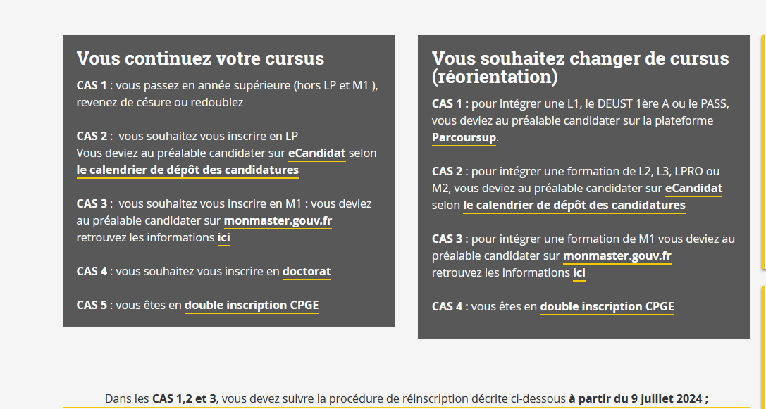 Jonathan Posted July 8, 2024 Posted July 8, 2024 "Vous continuez votre cursus" cas 1 Citation Dans les CAS 1,2 et 3, vous devez suivre la procédure de réinscription décrite ci-dessous à partir du 9 juillet 2024 ; Procédure Vous devez vous acquitter de la Contribution Vie Etudiante et de Campus CVEC sur cvec.etudiant.gouv.fr, Réinscription en ligne via RéIAweb, Attention : serveur incompatible avec les smartphones Dépôt des pièces justificatives dématérialisées à la fin de votre inscription (sous 8 jours maximum), Liste des pièces demandées Récupération du certificat de scolarité sur l'ENT dès la validation de votre inscription par la Scolarité Générale, Retrait du sticker : - Comment ? En prenant rendez-vous sur votre ENT à compter du 10 juillet 2024 - Où ? Dans le hall du bâtiment administratif central, yrr and Vava_ 2 Quote