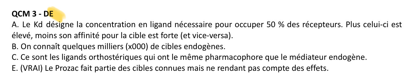 Bulledegum Posted September 19, 2024 Posted September 19, 2024 (edited) Bonjour, Je viens de faire ce QCM (poly Pass ICM 2024/2025) QCM 3 - À propos des cibles des médicaments : A. Plus le Kd d’une molécule est élevé, plus son affinité pour la cible est forte. B. 350 cibles endogènes sont connues. C. Les ligands allostériques ont le même pharmacophore que le médiateur endogène. D. Les Polyéthylènes glycols (PEG) sont utilisés comme laxatif osmotique ou purgatif. E. Les antidépresseurs de type « Prozac » font partie, comme le Paracétamol, des cibles totalement inconnues. Concernant l’item E, qui est considéré vrai dans la correction (page 13), le Prozac est une cible CONNUE mais ne rendant pas compte des effets, elle ne peut donc pas être TOTALEMENT inconnue. Je ne comprends pas trop si on doit mettre toutes les cibles mal connues ou inconnues dans le même panier, malgré l’emploi de termes comme « totalement ». Merci d’avance ! Edited September 19, 2024 by Yasmine6 Quote