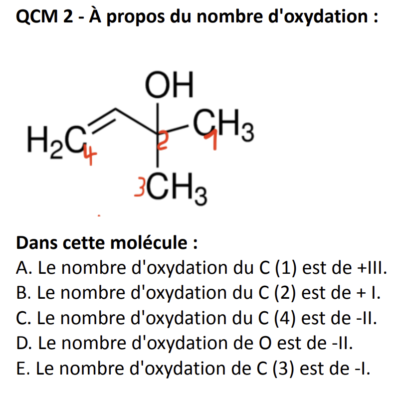 Ancien Responsable Matière Solution ilhamoxiciIline Posted October 7, 2024 Ancien Responsable Matière Solution Posted October 7, 2024 Salut @Morpheus531! Alors en ce qui concerne le no certains sont à savoir (no de O = -II ; no de H = +1 sauf cas particuliers) tout ce qu'il faut connaître est résumé dans cette diapo du cours https://zupimages.net/viewer.php?id=24/41/x29b.png Et d'autres no sont à déduire en fonction de l'environnement, c'est le cas du C comme ici Ce qu'il faut comprendre c'est que lorsqu'il n'est pas chargé, le C va chercher à "neutraliser" son environnement Ainsi son no sera positif s'il est entouré d'atomes plus électronégatif et négatif s'il est entouré d'atomes moins électronégatif Pour le qcm item A: le C (1) est entouré de 3H, chaque H à pour no +I (à savoir), 3 * +I = +III à compenser donc le C(1) aura pour no - III (l'item est donc FAUX) item B: le C(2) est lié à un O (-II) lui même lié à un H (+I) donc une des "charge" négative du O est compensé par H, il en reste une à compenser donc le no de C(2) = +I (l'item est VRAI) item C: le C(4) est lié à 2H son no est donc de -II (l'item est VRAI) item D: c'est à savoir et c'est VRAI item E: le C(3) a le même no que C(1) soit no = -III (l'item est FAUX) Bastitine, kècecé, Shoufre and 3 others 1 5 Quote