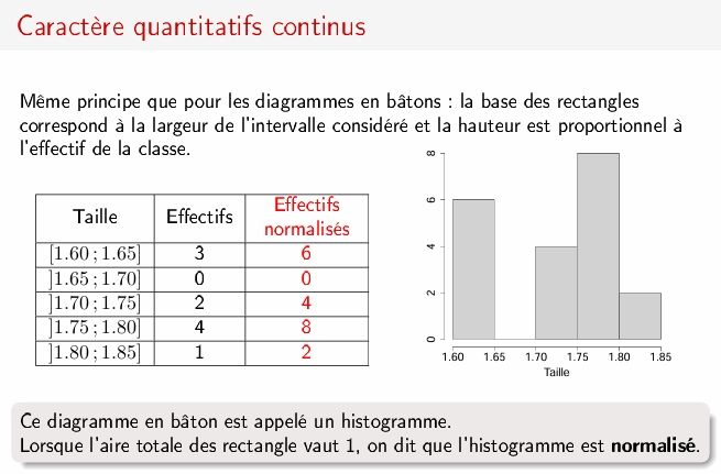Juncatécholamine Posted October 14, 2024 Posted October 14, 2024 Hey ! C'est peut être un peu tard mais si ça peut aider mieux vaut tard que jamais :) En gros dans le cours le prof explique que l'aire totale des rectangles de ton histogramme doit valoir 1, c'est à dire que dans l'exemple du cours, avec chaque rectangle ayant une base de 0,05 (= 1,65 - 1,60 par ex) et leurs hauteurs correspondantes l'aire totale fait 0,05 (6+0+4+8+2) = 1. Il est donc normalisé par rapport aux premières valeurs où l'aire totale aurait valu que 0,5. Dans l'exemple que tu donnes, l'aire totale = 0,5 x (1+1+2+4+6+1+1+3+3+2) = 12. Il n'est pas normalisé. Si tu veux le normaliser tu divise toutes tes hauteurs par 12 et ton aire totale sera bien égale à 1 et là il sera normalisé ! J'espère que ça aura pu t'aider ! Yuuki, lll and PASS1234 1 2 Quote