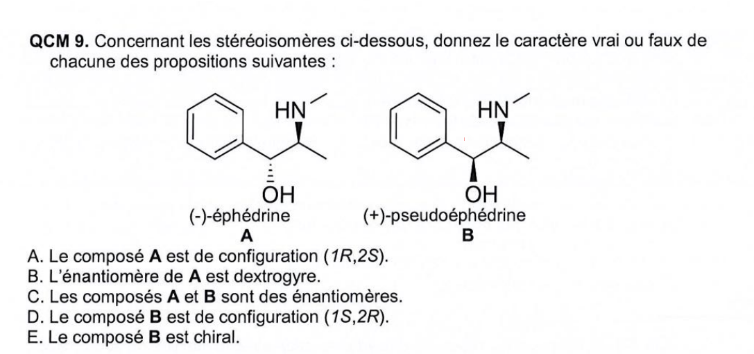 MileyVirus Posted October 15, 2024 Posted October 15, 2024 Bonjour ! alors je suis totalement perdue pour cette exo, et surtout pour la question D je ne comprend pas pk la molecule A est de la config 1R, 2S et la B 1S,2S alors que pour moi la molécule B est de la config 1R,2S, je ne lis pas le premier C* dans le sens inverse d'une aiguille. Ensuite, je suis aussi confuse au niveau de la priorité des groupement entre le cycle phényl et le groupement CH-NH2. Merciii Quote