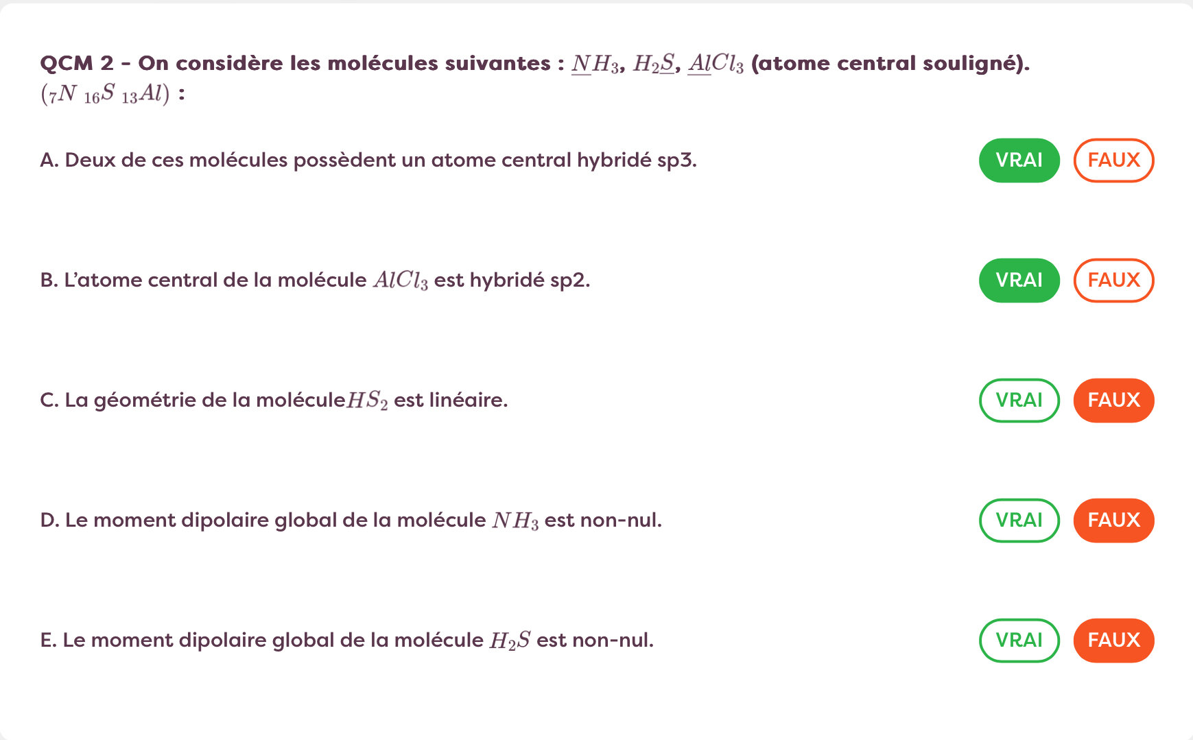 Solution ElIiot Posted October 15, 2024 Solution Posted October 15, 2024 (edited) Qd ta un un doublet d'électrons non liants le moment bipolaire est non nul et c'est le cas pour les 2 molécules. Edited October 15, 2024 by ElIiot Quote
