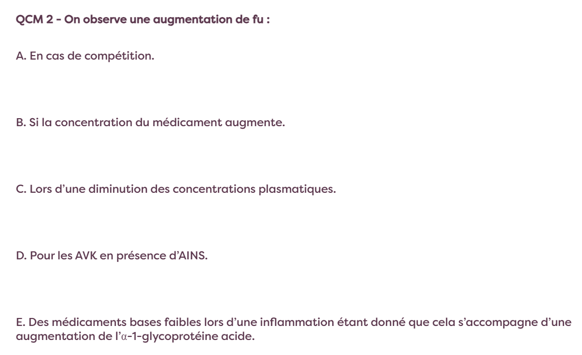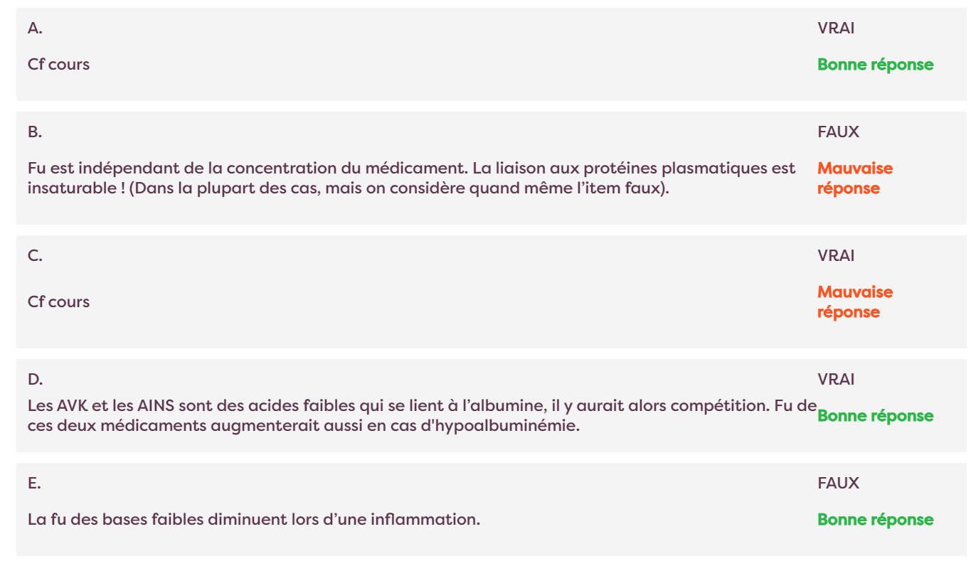 Jayco Posted October 17, 2024 Posted October 17, 2024 Bonjour, pk la B est fausse , certe les protéines plasmatiques sont insaturables mais que pour des concentrations données en medoc , mais si on va au-dela alors elle sera saturée donc fu augmenterait ?? Et si la B est belle et bien vrai , pk alors la C est vraie si fu dépend pas de concentrations , elle augmenterait donc quand la concentrations baisse ? Quote