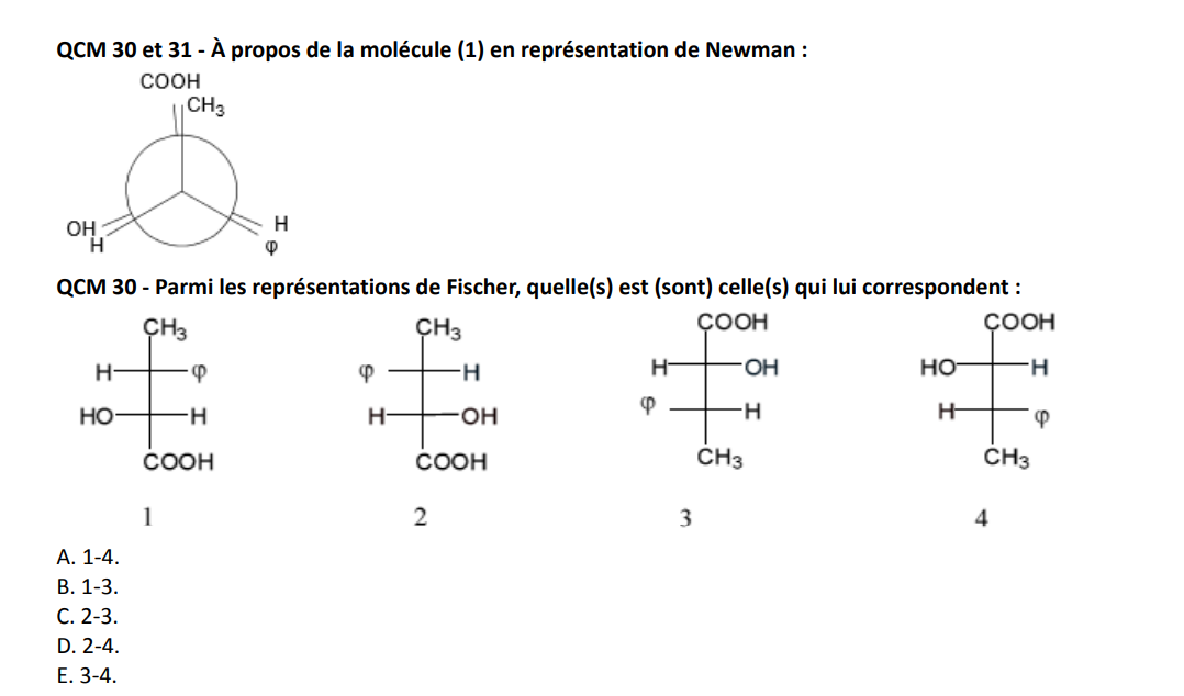 Élu Etudiant Solution OlivierP Posted October 23, 2024 Élu Etudiant Solution Posted October 23, 2024 Salut, La E ne peut pas être vraie car les deux carbones ont changé d'orientation et que la molécule n'est pas un composé méso. Dans la représentation de fischer, les éléments horizontaux sont en avant et ceux verticaux sont en arrière, ainsi si tu te représentes la molécule, tu vois que celle qui correspond est la 1, puis on voit que la représentation 3 est la même que la 1. Donc normalement la bonne réponse est la B joris 1 Quote