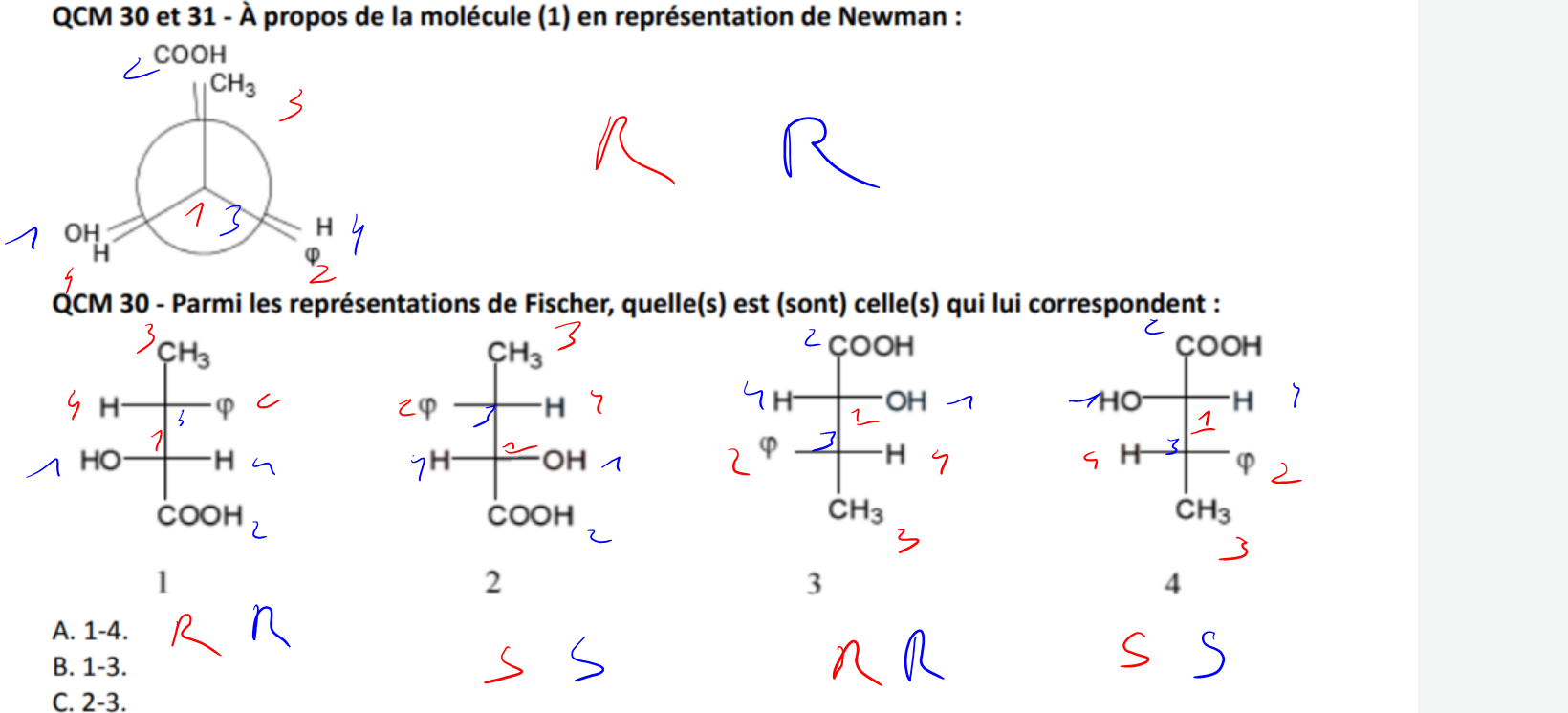 DJOLIPRANE Posted October 23, 2024 Posted October 23, 2024 pour moi la molécule 1 est vraie aussi si tu commences avec le CH3 en haut vu que c'est le groupement sur le cercle de devant (et qu'on veut la chaine carbonée la plus longue) on voit qu'à gauche du CH3 on a un H et à droite on a un phényl et que le cercle de derriere on a le COOH qu'on mets en bas et on garde les positions des groupements soit le H à droite et le OH à gauche donc on vient de représenter la molécule 1 apres tu peu la retrouner mettre le COOH en haut (tu vais une rotation à 180° et tu vois qu'elle correspond à la 3 donc pour la la réponse est B J'espere que c'est plus clair pour toi ! N'hésites pas si tu as d'autres questions Bonne soirée joris 1 Quote