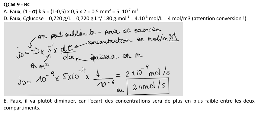 Responsable Matière thomASTROCYTE Posted November 17, 2024 Responsable Matière Posted November 17, 2024 Salut, dans le QCM 10 sur le déplacement moléculaire dans l'item B, on nous demande de calculer le flux diffusif de l'eau mais nous avons aucunes infos sur sa concentration qui apparemment serait 4 mol/m3 dans la correction, comment faut-il faire pour la trouver dans ce cas ??? merci ! Quote