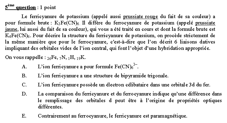 MaxTH Posted October 18, 2016 Posted October 18, 2016 Bonjour, Dans la question E (item compté vrai), je ne comprend pas pourquoi le ferricyanure est paramagnétique. J'ai fait sa structure électronique et je trouve la même que celle du ferrocyanure de potassium faite en cours, donc il ne devrait pas être diamagnétique? Merci d'avance pour votre réponse