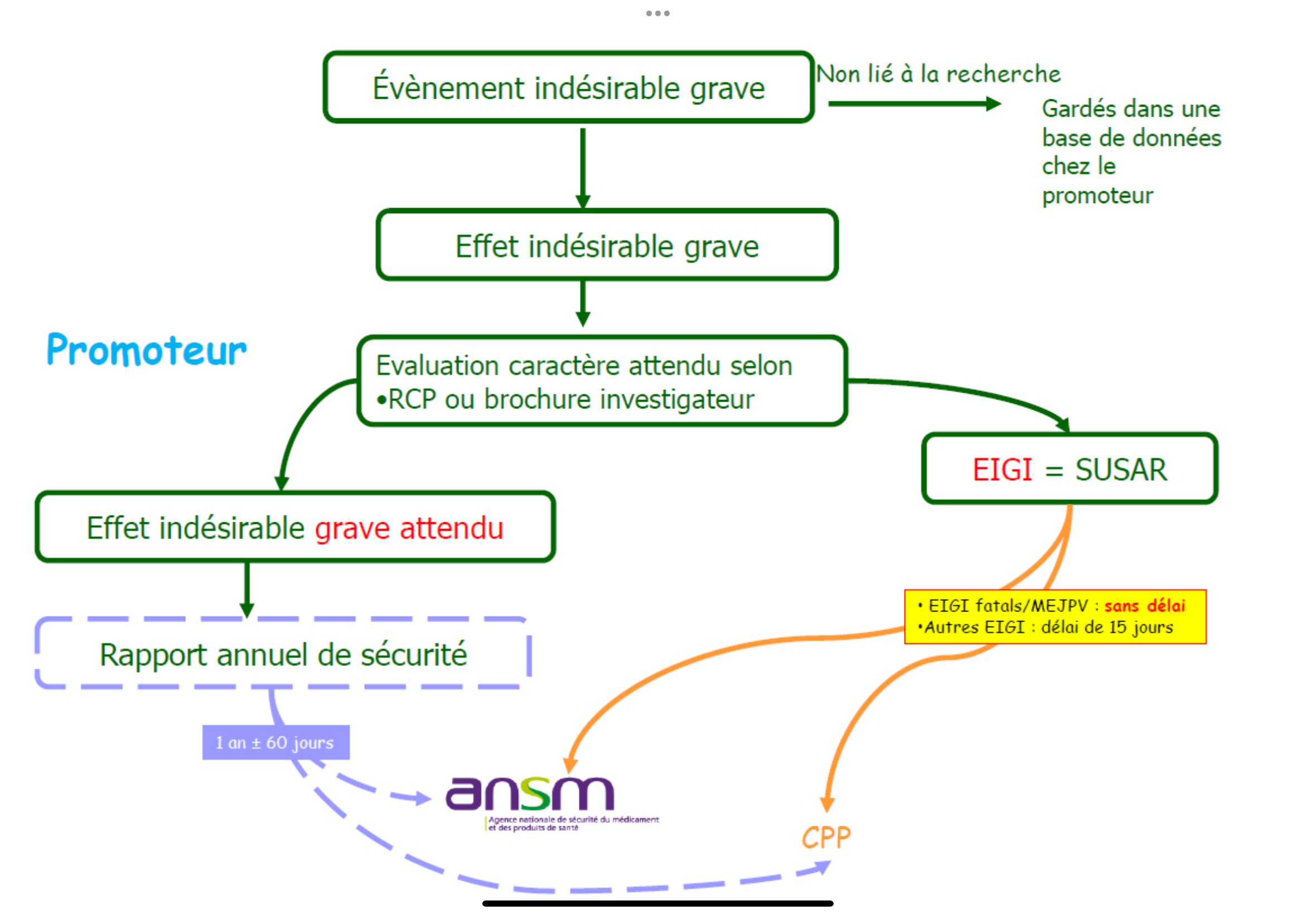 Responsable Matière lucasdlng Posted November 22, 2024 Responsable Matière Posted November 22, 2024 Bonjour ! J'avais une question concernant un qcm du poly TAT 2024/2025 en ICM sur le chapitre des essais cliniques. QCM 7 : "D. Pendant la recherche, le promoteur a 48h pour déclarer les événements indésirables graves à l'ANSM et au CPP." (FAUX : -> 24H). Or dans le cours du TAT sur le schéma il est noté que si effet grave indésirable est attendu -> rapport annuel de sécurité si inattendu fatal -> sans délais, et non fatal -> 15J Je ne comprends pas à quoi fait référence la correction du coup, si quelqu'un pourrait m'expliquer. Merci beaucoup et bonne journée ! Quote