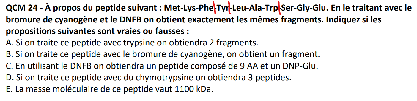Tuteur jeantibio Posted November 23, 2024 Tuteur Posted November 23, 2024 Salut, j'avais une question concernant l'item D: Selon moi si l'on utilise la chymotrypsine on obtient 3 peptide et 1 AA tout seul (Tyr). Est-ce que dans ce genre de question on parle en terme de fragment sans faire de différence entre peptide et AA ? ou j'ai pas compris ? Item: Correction: D.- 4 fragments. Quote