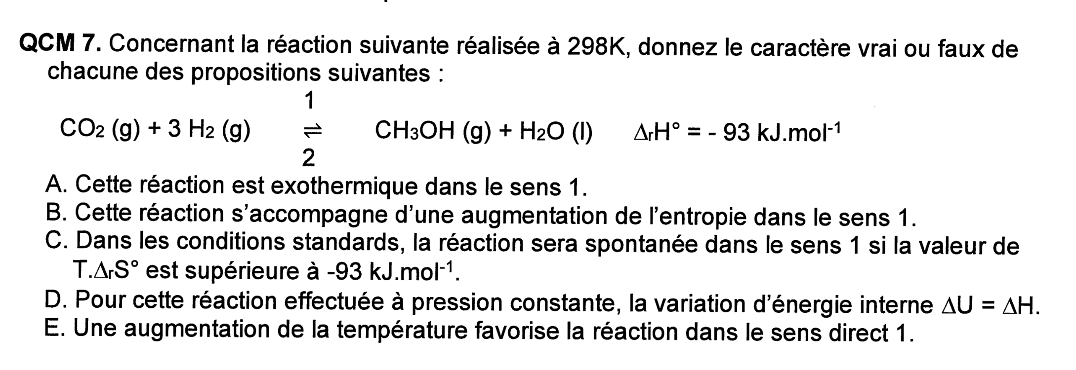 Solution lanouille Posted December 3, 2024 Solution Posted December 3, 2024 coucou @KASHLO33 quand tu as la valeur comme dans ce qcm de deltaH soit la variation d'enthalpie, cela te donne l'information si la réaction est endothermique (consomme de la chaleur) ou exothermique (libère de la chaleur) si delta H > 0 la réaction est endothermique, si delta H < 0, elle est exothermique ici on ne te pose pas de question sur le principe Le Chatelier du type "si la température augmente, la réaction va dans tel sens" mais juste de savoir si elle consomme ou libère de la chaleur le sens 1 correspond au sens dit "direct" donc de la gauche vers la droite (comme écrit sur l'énoncé) avec donc delta H < 0 donc exothermique attention par contre, l'enthalpie ne te permet pas de trouver le sens de la réaction ! ça c'est le role de l'enthalpie libre delta G j'espère t'avoir aidé et si tu as d'autres questions n'hésite pas :) ilhamoxiciIline and Shoufre 2 Quote