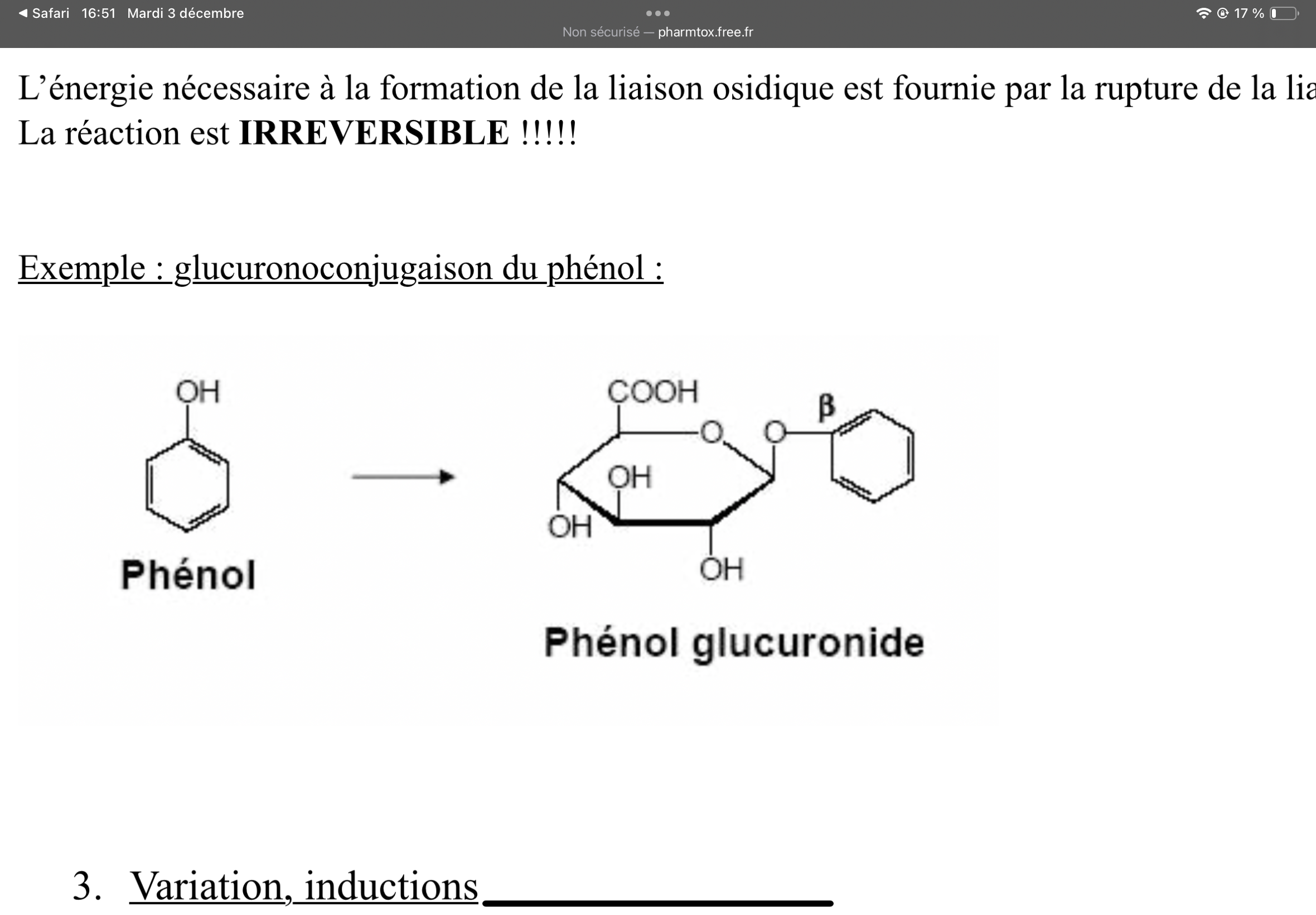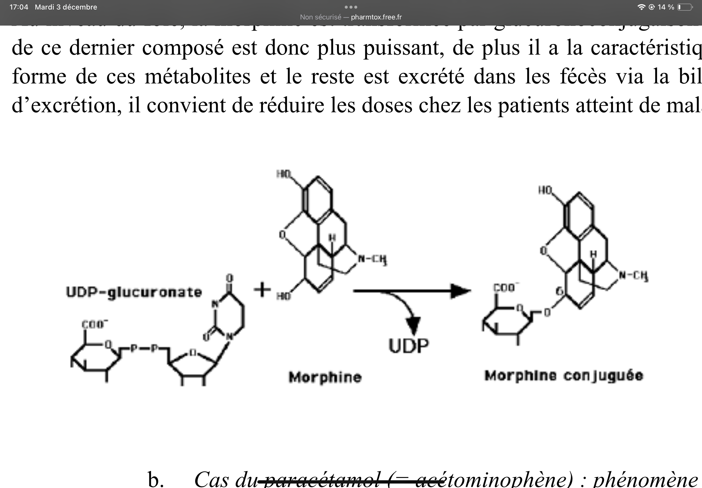 FuturDocteurMamourV2 Posted December 3, 2024 Posted December 3, 2024 (edited) Salut ! Alors en fait les glucoronoconjugaison sont des types de métabolisation du médicaments. Se sont des réactions dites de phase 2 car elles ont souvent lieu après une première réaction de phase 1 qui consiste à simplement ajouter un groupement fonctionnel (OH par exemple) au médicament qui servira ensuite de site d’ancrage pour le groupement ajouté en phase 2. Ce sont donc des réactions catalysé par des enzymes appelées transferases qui ont lieu en grande majorité au niveau du foie et dont le but est de rendre inactif un médicament en ajoutant un groupement polaire de type glucose. Les groupements ajouté sont donc beaucoup plus conséquents que que lors des réactions de phase 1 se sont des complexes moléculaires (glucose). Cela permet en plus de rendre inactif le médicament d’augmenter l’hydrophilie du médicament et ainsi son excrétion rénale. Attention les médicaments qui subissent une glucoronoconjugaison sont considéré comme éliminé par métabolisation et non pas par excretion rénale car c’est le foie dans un premier temps qui rend inactif le médicament en le métabolisant, le métabolite est ensuite excrété. TOUS les médicaments subissant une glucoronoconjugaison sont par la suite de cette réaction inactif SAUF la morphine son métabolite glucuronide-6-phosphate est toujours actif. Je te met un exemple simple de glucoronoconjugaison (c’est pas vraiment un médicament le phénol mais c’est juste pour illustrer la réaction) Juste pour illustrer un peu mieux voici la glucoronoconjugaison de la morphine. Tu as au début la morphine telle qu’elle (la morphine ne subit pas de réaction de phase 1 avant sa glucoronoconjugaison c’est un peu une exception sur ça aussi) + un glucose conjugué à un UDP. L’enzyme va prendre en charge le morphine et l’UDP glucoronate enlever l’UDP du glucose et le remplacer par la morphine qu’elle fixe donc sur le glucose. Ainsi ta morphine est plus hydrophile donc plus facile à excréter au niveau rénale (et toujours active mais c’est parce que c’est la morphine sinon tous les autres médicaments sont inactif après ça) J’espère que c’est plus clair pour toi ! Edited December 3, 2024 by FuturDocteurMamourV2 Clem_encéphale, rosembcéphale, alicetone and 1 other 2 2 Quote