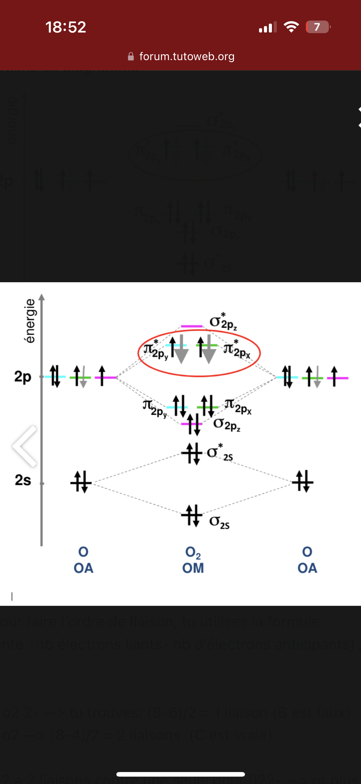 Solution ma_gnesium Posted December 3, 2024 Solution Posted December 3, 2024 (edited) Salut !! Pour calculer l’OL tu as besoin de connaître les électrons liant et les non liants. Ici l’o2 2- à gagner deux électrons, si tu fais le diagramme moléculaire tu retrouve 8 électrons liants et 6 non liants. Tu obtiens donc (8-6)/2 =1 Je te met le diagramme avec les deux électrons gagnés par l’ion en gris. J’espère que ça t’aura aidé Bon courage Edited December 3, 2024 by ma_gnesium Catalyse and maelysine 2 Quote