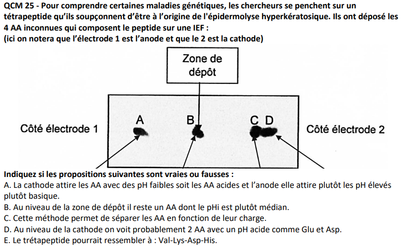 Solution PolymeraseN Posted December 5, 2024 Solution Posted December 5, 2024 (edited) il y a 45 minutes, Elalastique a dit : Bonjour, j'ai beaucoup de mal avec le QCM 25 (les items DE) du sujet 3 du poly de l'avent en biochimie, les réponses sont BCDE mais ne sont pas détaillées donc je n'arrive pas à comprendre comment aborder ce type d'exercice. Est-ce possible de me détailler la réflexion s'il vous plait ? Salut chef ! Ici, il va falloir que tu aies une idée du pHi de tes différents AA. En effet, ici, tu es sur une IEF. Le principe est, d'une part, la présence d'un champ électrique, puisque tu as une anode (électrode 1) et une cathode (électrode 2), mais également un gradient de pH. Tout d'abord, le champ électrique va permettre de faire migrer tes AA chargés au niveau de la zone de dépôt. À ce niveau là, le pH est plutôt neutre. Ainsi, il va y a avoir une première différenciation entre les AA puisque 3 cas se dessinent : - si pH>pHi : l'AA sera chargé négativement et migrera donc vers l'anode (+) - si pH = pHi : l'AA sera neutre et ne migrera donc pas - si pH < pHi : l'AA sera chargé positivement et migrera donc vers la cathode (-) De plus, le pH augmente graduellement de l'anode vers la cathode pour que chaque AA s'arrête lorsque pH = pHi. Sachant que l'anode attire les AA qui ont un pH faible, une faible valeur de pH sera nécessaire de ce côté pour être dans le cas pH = pHi et inversement pour le côté de la cathode. Il est donc ici intéressant de connaître les pHi de tes AA, ou d'avoir une idée en fonction des différents types d'AA (par exemple les dibasiques auront forcément un pHi très élevé, conféré par leurs radicaux...) En espérant avoir répondu à ta question ! Edited December 5, 2024 by PolymeraseN Elalastique and sofiaspirine 1 1 Quote
