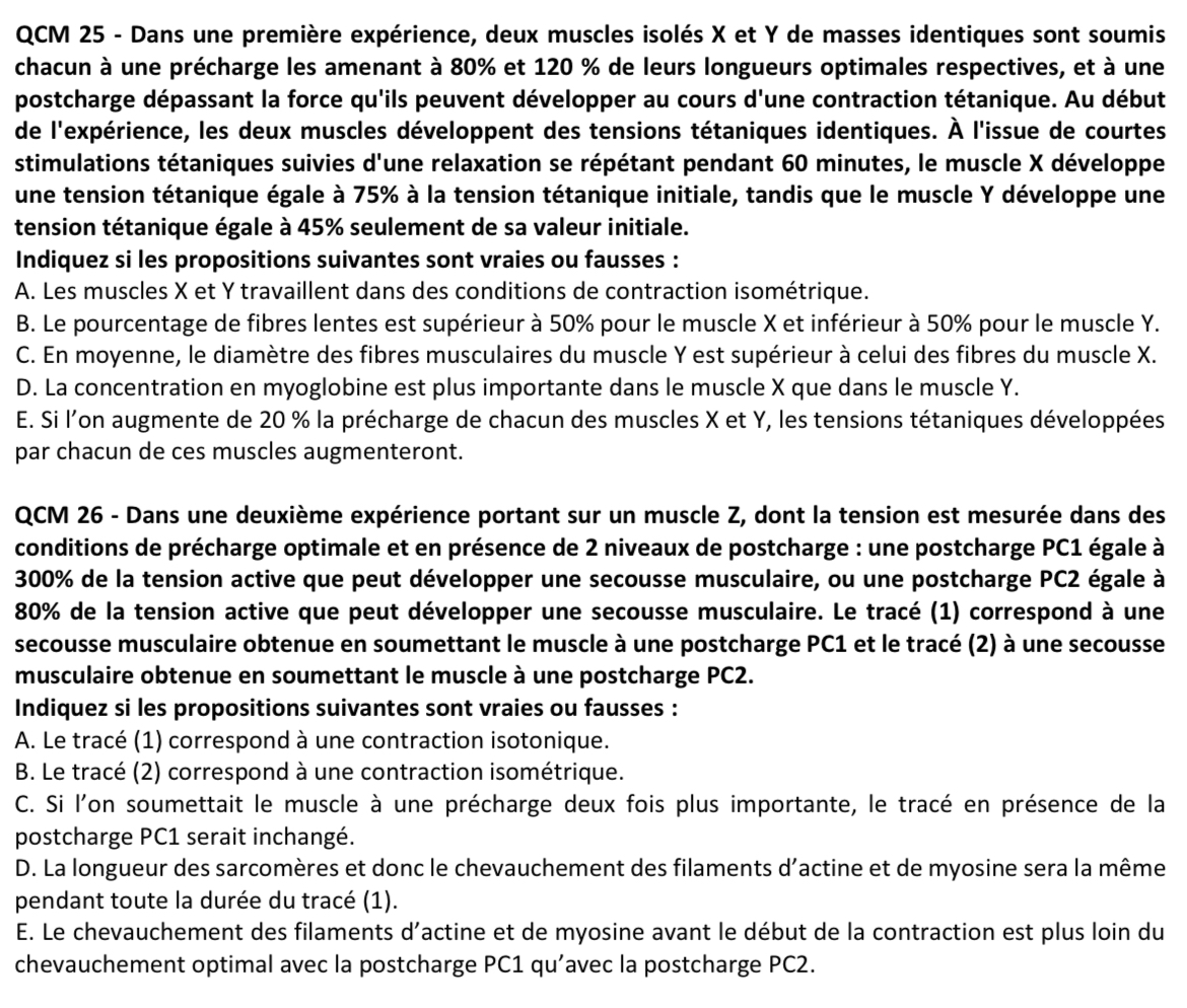 Ancien Responsable Matière Solution em. Posted December 6, 2024 Ancien Responsable Matière Solution Posted December 6, 2024 Il y a 6 heures, Bichette81 a dit : Bonjour ! J’ai fait ces deux qcms du poly de l’avent et je ne comprends pas comment trouver si les conditions de contraction sont isométrique ou isotoniques, je sais théoriquement que l’isométrie implique que la longueur reste la même et l’inverse pour l’isotonique mais en qcm je n’arrive pas à déchiffrer l’expérience expliquée … Si quelqu’un pourrait m’expliquer ces deux qcms ça m’aiderait beaucoup Mercii Salut ! Je t'invite à aller voir les posts suivant sur le même type de QCM, je pense que ça va t'aider à comprendre : https://forum.tutoweb.org/topic/106579-physiologie-musculaire/ https://forum.tutoweb.org/topic/106317-physio-muscu-qcm-contraction/ https://forum.tutoweb.org/topic/106356-quelques-questions-physio/#findComment-559040 https://forum.tutoweb.org/topic/106378-physio-muscles/#findComment-559157 Si jamais ce n'est toujours pas clair, n'hésite pas à nous le dire et on réexpliquera ! Bonne soirée et bon courage ! :) Quote