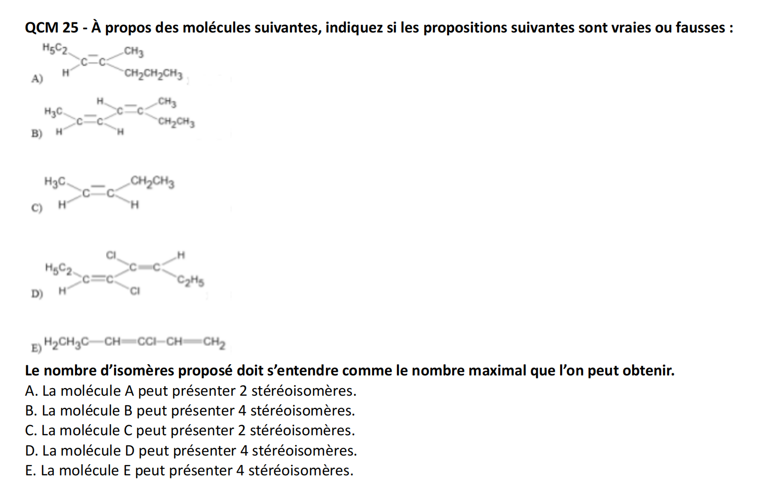 Podn Posted December 6, 2024 Posted December 6, 2024 Bonjour, dans le qcm 25 du poly de Chimie : La correction nous dit que : Pourquoi dit on qu'il y a 3 stéréoisomères dans le cas de la proposition D car EZ = ZE mais pas dans le cas de la proposition B ? Merci d'avance Quote