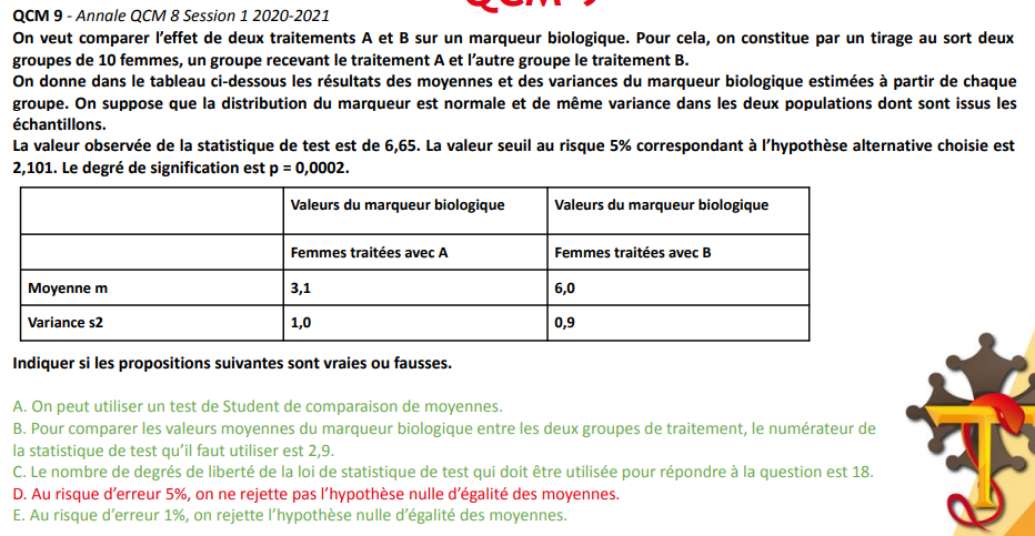Bonsoir, j'ai un souci avec ce QCM je n'y arrive pas est ce que vous pouvez m'expliquer s'il vous plaît ? Je bloque pour l'item B, et E Comment on fait pour trouver la valeur 2,9 pour l'item B ? Pour l'item A c'est bien vrai parce qu'on a un n> 5 ? Merci d'avance !