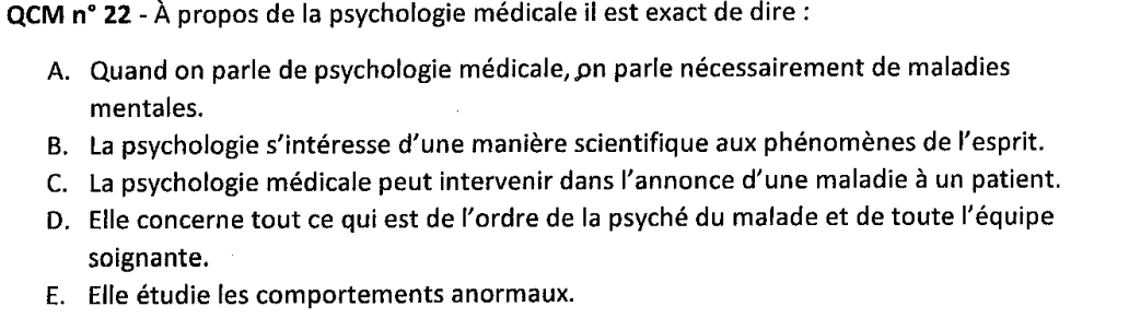 Tuteur Palamine Posted December 7, 2024 Tuteur Posted December 7, 2024 Bonsoir c'est à propos d'un item que je ne sais pas trop comment considérer à propos de la psychologie médicale, l'item E est compté faux : "elle étudie tous les comportements" mon problème étant le suivant dans la formulation je ne voie aucun terme restrictif alors dans la mesure où on les étudies effectivement tous (partie entière du cours consacrée à la maladie psychiatrique et la définition de comportement normaux ou anormaux) je ne vois donc pas en quoi cet item est faux ce qui m'embête grandement si l'item venait à retomber... Merci d'avance pour ta réponse =) Quote