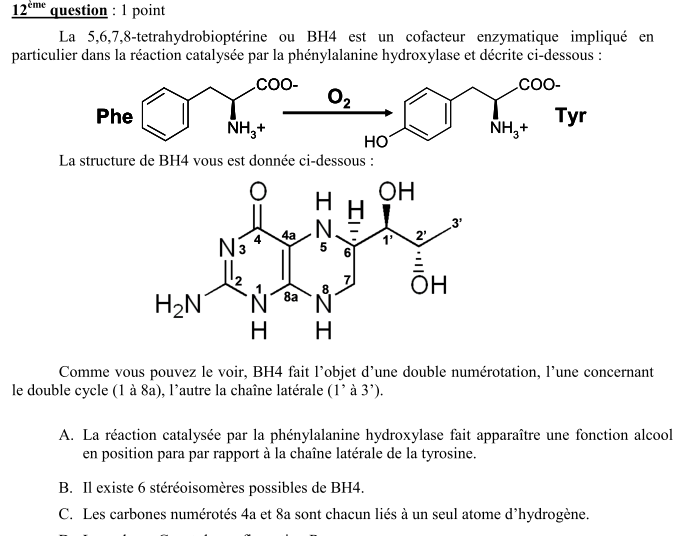 Mj09r Posted October 24, 2016 Posted October 24, 2016 Bonsoir, pour l'item c vu qu'il y a 3 carbones asymétriques dans BH4 il ne devrait pas y avoir 2^3=8 stéréoisomères plutot ?? et ensuite dans le deuxieme exercice je comprends pas comment on arrive à trouver +8...