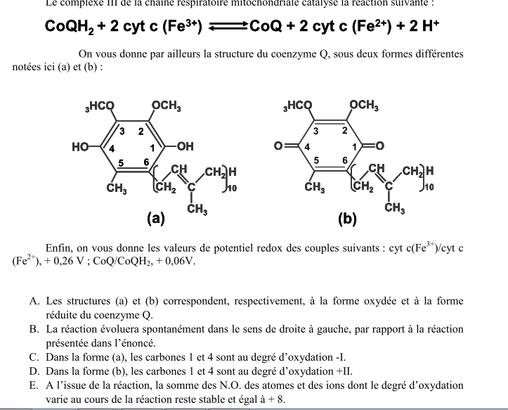 Ancien du Bureau MyriamC Posted October 25, 2016 Ancien du Bureau Posted October 25, 2016 Bonjour Pour le c, si, tu as raison, c'est bien pour ça que la proposition est fausse ^^ Ensuite, pour le e, pour trouver +8, tu dois considérer le NO des C portant les -Oh qui vont devenir =0, mais aussi les Fe qui vont passer de 3+ à 2+ ce qui te donne : - A "gauche" : C=+1 (x2) Fe = +3 (x2) - A "droite" : C= +2 (x2) Fe = +2 (x2) Voilà