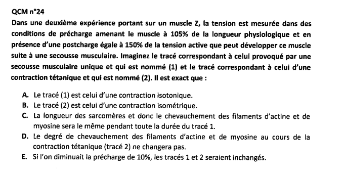 toti Posted December 8, 2024 Posted December 8, 2024 Bonsoir, je comprends pas pourquoi la E est vraie, pour moi si on diminue la precharge alors le trace 2 vas changer car c'est une contraction isotonique Quote