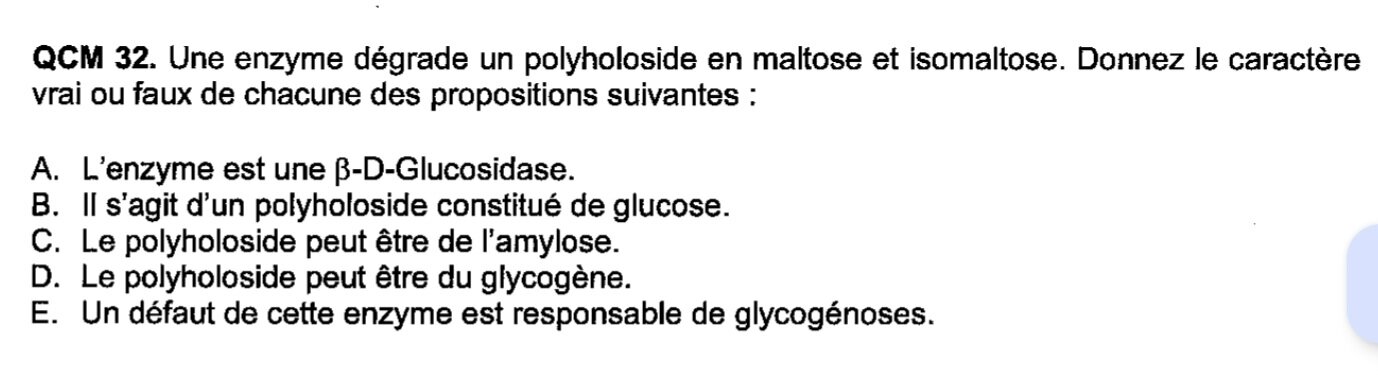 Solution AshGrey Posted December 10, 2024 Solution Posted December 10, 2024 Salut @Lili418, perso j'aurai dit que c'est faux car les enzymes lors de la glycogénolyse n'ont d'une part pas cette action-là mais tu ne pouvais pas savoir puisque c'est pas en PASS qu'on voit ça et surtout chez les humains on ne produit pas d'isomaltose, donc même si tu savais pas si cette enzyme participait dans la glycogénolyse, le fait qu'il parle d'isomaltose peut te dire que ça ne se passe pas au niveau du métabolisme humain. J'espère t'avoir un peu plus éclairé :) Lili418, YOUSSPHENOÏDAL and sofiaspirine 2 1 Quote