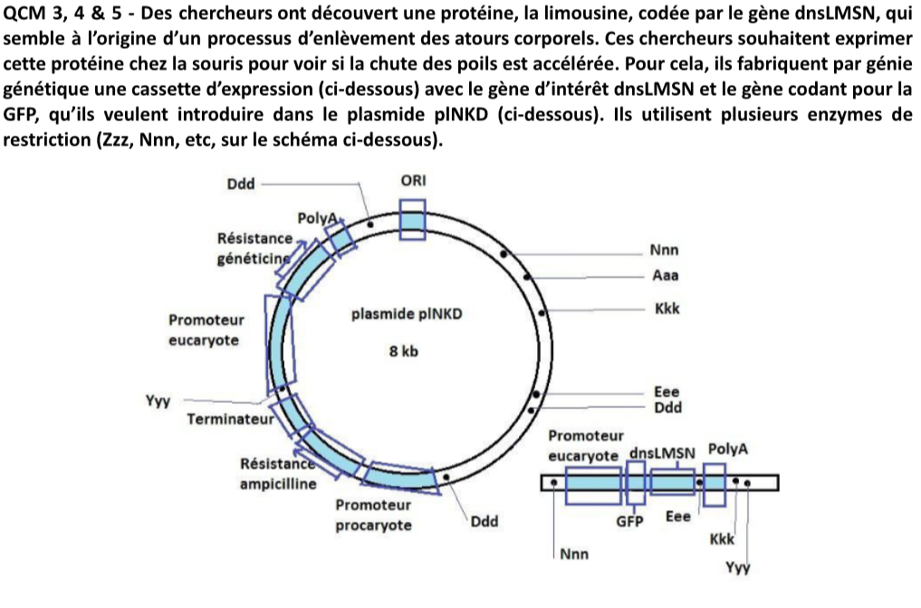 Responsable Matière PauliNébuline Posted January 7 Responsable Matière Posted January 7 Salut! (Toute à l'heure je n'avais pas vu cette catégorie, bon je ne suis toujours pas sure d'être au bon endroit, ces nouveaux UE ça me perd) "C. Des fibroblastes de souris sont transfectés avec des vecteurs recombinants. Si ces cellules expriment la GFP, la présence du gène dnsLMSN dans leur génome est certaine. D. Ces mêmes fibroblastes expriment obligatoirement la Limousine." Même avec la correction je ne comprends pas pourquoi la D est vrai : D. (Vrai) La GFP et dnsLMSN sont dans le même cadre de lecture ouvert, on considère donc que si l’un est exprimé lautre est aussi présent dans le génome. Attention par contre ce n’est pas parce qu’un gène est présent qu’il sera forcément exprimé ! Merci! Quote