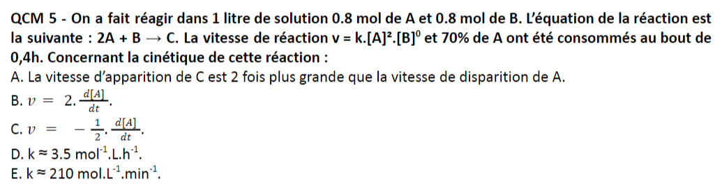 Responsable Matière PauliNébuline Posted January 12 Responsable Matière Posted January 12 (edited) Salut! Comment faire pour résoudre les items D et E? Pourquoi ce n'est pas v=-2*(d[A]/dt)? La correction c'est CD. Merci! Edited January 12 by PauliNébuline Quote