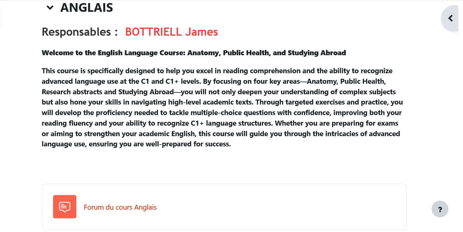 Yuuki Posted January 18 Posted January 18 (edited) Hello ! Oh wow. Tout a changé effectivement... Les modules de l'année dernière (que nous avions pour la plupart commencé) sont maintenant dans la rubrique "ANGLAIS - External resources" qui est à mon avis en complément (facultative). Les nouveaux modules pour cette année seraient : ANATOMY (le nouveau module) PUBLIC HEALTH & AI Medical ABSTRACTS Studying abroad (?)* *Ce module est cité dans le paragraphe d'intro mais aucune trace (pour l'instant) sauf le module "Going Abroad" en Extra Work. "By focusing on four key areas—Anatomy, Public Health, Research abstracts and Studying Abroad—you will not only deepen your understanding of complex subjects but also hone your skills in navigating high-level academic texts." Donc oui, je pense qu'il faut lire les PDF et répondre aux tests pour s'entraîner... En attente de d'autres réponses du coup. Edited January 18 by lxxuane sofiaspirine 1 Quote