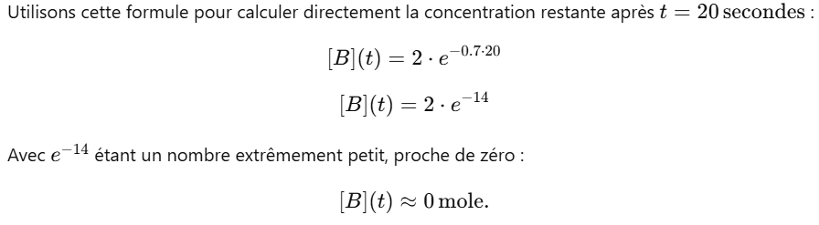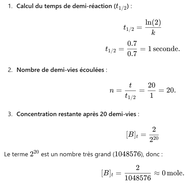 artheme Posted January 19 Posted January 19 @Rhomolium Données du problème : Réaction d’ordre 1. [B]0 = 2 moles, k = 0.7 s−1 , t = 20 secondes. Formule 1 : [B](t) = [B]0 ⋅ e−kt [B](t) : Concentration restante au temps t. [B]0 : Concentration initiale (ici 2 moles). k : Constante de vitesse (0,7 s−1). t : Temps (20s). Cela prouve que la concentration restante est bien inférieure à 90 % de [B]0. PS : Cette formule est universelle et utilisée pour calculer la concentration restante [B](t) à n'importe quel temps t dans une réaction d'ordre 1. Elle est dérivée directement de l'équation différentielle de la cinétique chimique et est applicable dans tous les cas, peu importe le temps ou la situation. Formule 2 : Utilisons cette formule pour vérifier la cohérence avec les temps de demi-réaction : Encore une fois, la concentration est bien inférieure à 90 % de [B]0. PS : Cette formule est une simplification de la formule générale, utilisée uniquement quand le temps t est un multiple exact du temps de demi-réaction (t = n ⋅ t1/2) Elle découle du fait qu’à chaque demi-vie, la concentration diminue de moitié, et elle est donc pratique pour les calculs rapides lorsque le temps est lié aux demi-vies. Conclusion : Les deux formules confirment que la concentration restante après 20 secondes est quasiment nulle, donc l’item E est FAUX. Rhomolium 1 Quote