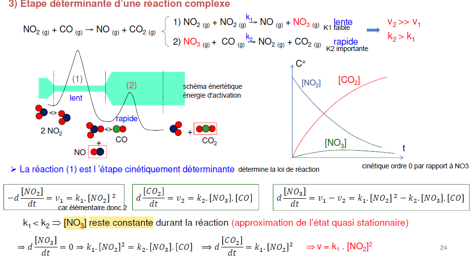 Tuteur àfond Posted January 23 Tuteur Posted January 23 Bonjour, je ne comprends pas trop la démonstration de cette diapo... 1) je ne comprends pas pourquoi on par de -d(NO2)/dt et d(CO2) 2) Pourquoi on peut dire v = D(CO2)/dt = K1NO2^2 et on part pas tout simplement de v = -d(NO2)/dt ? Bref si quelqu'un peut m'expliquer les étapes de la démo je serai super reconnaissant. Merciii d'avance !!!! Quote