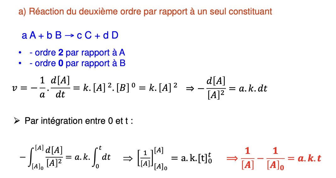 Solution lu_ranium Posted January 26 Solution Posted January 26 Salut @Rhomolium ! Face à une réaction d'ordre 2, il y a 2 possibilités : Soit il s'agit d'une réaction d'ordre 1 par rapport à A et à B (où A et B sont dans des quantités stoechiométriques) : dans ce cas, la formule exprimant la vitesse s'écrit v = k.[A]1.[B]1. Or, puisque les deux constituants se trouvent en quantités stoechiométriques, nous avons [A]/a = [B]/b donc [B] = b/a.[A]. Ainsi, dans la formule, on peut remplacer [B] par b/a.[A], ce qui donne : v = k.b/a.[A]2. En utilisant l'autre formule de la vitesse (v = -1/a.d[A]/dt), on obtient -1/a.d[A]/dt = k.b/a.[A]2. En multipliant les deux cotés par a et par dt et en divisant les deux cotés par [A]2, on obtient -d[A]/[A]2 = b.k.dt. En intégrant entre 0 et t, on a alors [A]/[A]2 - [A]0/[A]02 = 1/[A] - 1/[A]0= b.k.t. Voici la partie du cours expliquant le raisonnement à suivre : Soit il s'agit d'une réaction d'ordre 2 par rapport à un seul constituant (A ou B). Ici, la formule expriment la vitesse s'écrit v = k.[A]2.[B]0 (si c'est d'ordre 2 par rapport à A). Nous avons donc -1/a.d[A]/dt = k.[A]2. En multipliant par a et par dt des deux cotés et en divisant par [A]2 des deux cotés, on obtient -d[A]/[A]2 = a.k.dt. En intégrant entre 0 et 1 on a alors [A]/[A]2 - [A]0/[A]02 = 1/[A] - 1/[A]0= a.k.t. Voici la partie du cours expliquant le raisonnement : J'espère que c'est plus clair pour toi ! Si tu as d'autres questions, n'hésite pas ! alicetone and Rhomolium 2 Quote