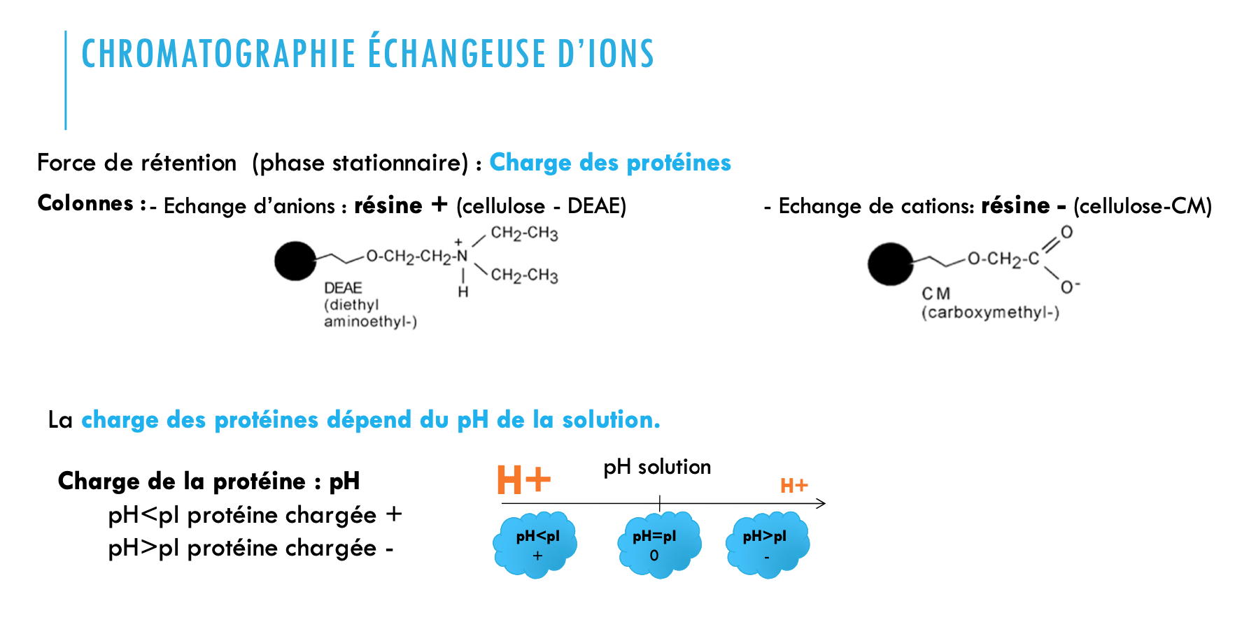 Solution jlr.10 Posted February 4 Solution Posted February 4 Salut @chapeau ! Alors si tu parle bien de cette diapo : Il faut bien comprendre déjà le principe de la chromatographie, de manière simplifiée c'est une phase stationnaire = la colonne et une phase mobile = la solution qui passe dans la colonne et qui contient potentiellement ta protéine d'intérêt. Une chromatographie échangeuse d'ions est une chormatogrpaie qui va te permettre de séparer ta protéine d'intérêt en fonction de sa charge positive (+) ou négative moins (-) : il faut savoir que les charges contraires s'attire c'est à dire le + est attiré par le - et inversement la charge d'une protéine dépend du pH de la solution où elle se trouve le pI = point isoélectrique d'une protéine est le pH (de la solution où se trouve la protéine) pour lequel la protéine est neutre, c'est à dire qu'elle porte autant de charges positives que de charge négatives. le pI diffère d'un type de protéine à l'autre. si le pH de la solution est < au pI de la protéine alors celle-ci sera globalement chargée positivement (plus précisément la protéine portera plus de charges positive que négative) si le pH de la solution est > au pI de la protéine alors celle-ci sera globalement chargée négativement (plus précisément, elle portera plus de charge négative que positives ) Ainsi pour faire une chromatographie échangeuse d'ion il faut connaitre le pI de ta protéine d'intérêt, ainsi que le pH de la solution dans laquelle elle se trouve pour choisir la bonne phase stationnaire. Exemple : la pI de ma protéine d'intérêt est de 5 le pH de la solution (phase mobile) dans laquelle ma protéine se trouve est de 8 ainsi le pI < pH --> je sais alors que dans cette solution ma protéine d'intérêt est chargée globalement positivement je vais donc utilisé une phase stationnaire chargée négativement comme le CM (les contraires s'attirent donc le positif s'accroche sur le négatif) je suis alors entrain de réalisé une chromatographie échangeuse de cations. lorsque je verse la phase mobile (ma solution contenant la protéine d'intérêt) à travers la phase stationnaire toutes les protéines chargée positivement vont s'accroché à la phase stationnaire, pour être sur que seule ma protéine s'accroche il faudra modifier progressivement le pH de la phase mobile afin de faire en sorte que seulement ma protéine d'intérêt soit positive dans toute la solution (mais ça je ne sais pas si la prof la détaillé). J'espère que c'est plus claire, n'hésite pas si tu as d'autres questions ! Bon courage ! Fodiliaque and chapeau 1 1 Quote