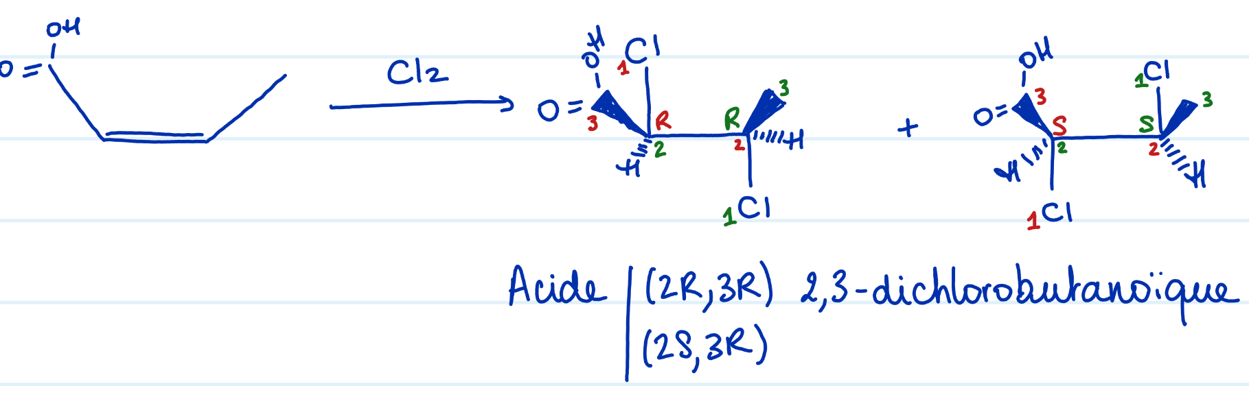shimy_z Posted February 5 Posted February 5 Salut, salut Il faut d'abord que tu écrives correctement le composé donné, et que tu vois ce que fait le dichlore sur cette molécule grâce au cours. On sait que l'addition d'un dichlore est une dihalogénation, donc une trans addition électrophile. Comme c'est une addition sur des alcènes, c'est stéréospécifique. N'hésites pas si tu as des questions !!! chapeau 1 Quote