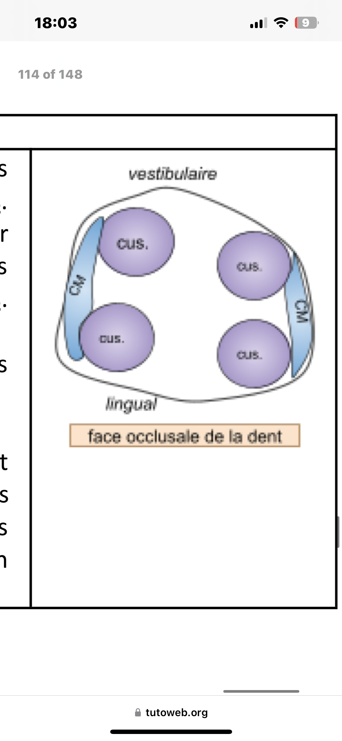 Solution myelina Posted February 6 Solution Posted February 6 Salut je vais essayer de t'expliquer ça en ajoutant des photos ( qui sont d'ailleurs disponibles dans les fiches de cours sur la librairie ;) ) Alors il y a les crêtes marginales sur les dents antérieur. Elles correspondent à un saillie ( element convexe ) sur la partie mésiale et distale de la face linguale des dents ( c'est a dire sur les 2 bord latéral de la dent ). Elles sont étendu longitudinalement ( = de haut en bas ) Apres il y a les crêtes marginales sur les dents postérieurs. Il est situé entre l'union des cuspide vestibulaire et lingual et sont disposé transversalement du coté lingual au coté vestibulaire. pour les photos CM c’est la crête marginal Rhomolium and lisonsome 2 Quote