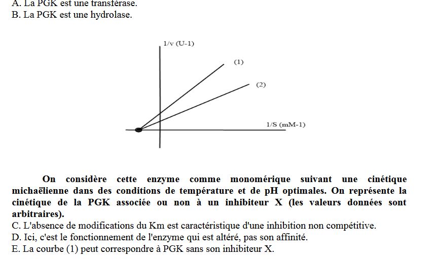 Solution Chloe-M Posted November 7, 2016 Solution Posted November 7, 2016 Il s'agit d'une inhibition non compétitive dans ce QCM, puisque tu vois bien que le Km n'est pas modifié (le point -1/Km est le même), en revanche Vm l'est, et donc c'est le fonctionnement de l'enzyme qui est altéré.