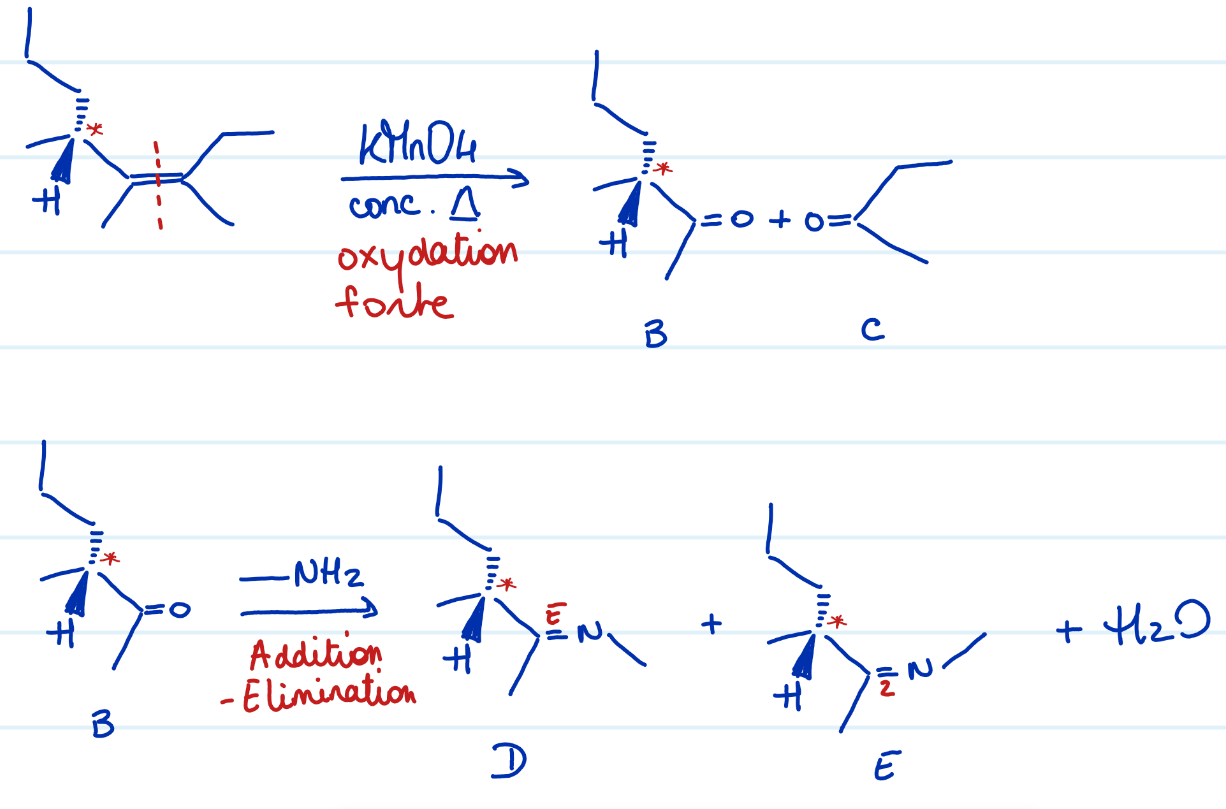 Solution shimy_z Posted February 15 Solution Posted February 15 Salut, salut Ci-dessous tu trouveras les réactions. La première réaction est une réaction d'oxydation forte, donc on coupe l'alcène en deux, et on "rajoute" un O doublement lié à la place. On obtient la molécule C butan-2-one, et la molécule B (3R)-3-méthyl-hexan-2-one (/!\Le H est à l'avant donc on inverse, et c'est le B car possède un centre optiquement actif). Ensuite, la deuxième réaction est une addition-élimination en présence d'une amine primaire, donc on va former une imine. On obtient D et E qui sont des diastéréoisomères (ou isomères géométriques), en sachant que l'isomère E est toujours plus stable que le Z donc c'est le D. J'espère que j'ai répondu à toutes tes questions, sinon n'hésites pas !!! Bastitine and Shoufre 1 1 Quote