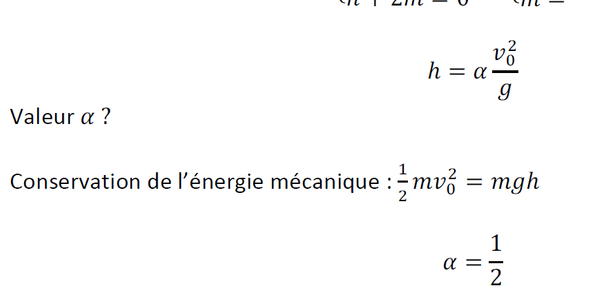 Responsable Matière ju.gulaire Posted February 15 Responsable Matière Posted February 15 Ici il te faut remplacer h par l'expression donnée, tu as donc du côté gauche de ton équation m*g*v0²*alpha/g → par simplification les g s'en vont tu as ainsi 0.5*m*V0² = m*V0²*alpha → pareil tu simplifie en divisant à droite et à gauche par m*V0² et il te reste 0.5=alpha → soit alpha = 1/2 ! Med81 1 Quote