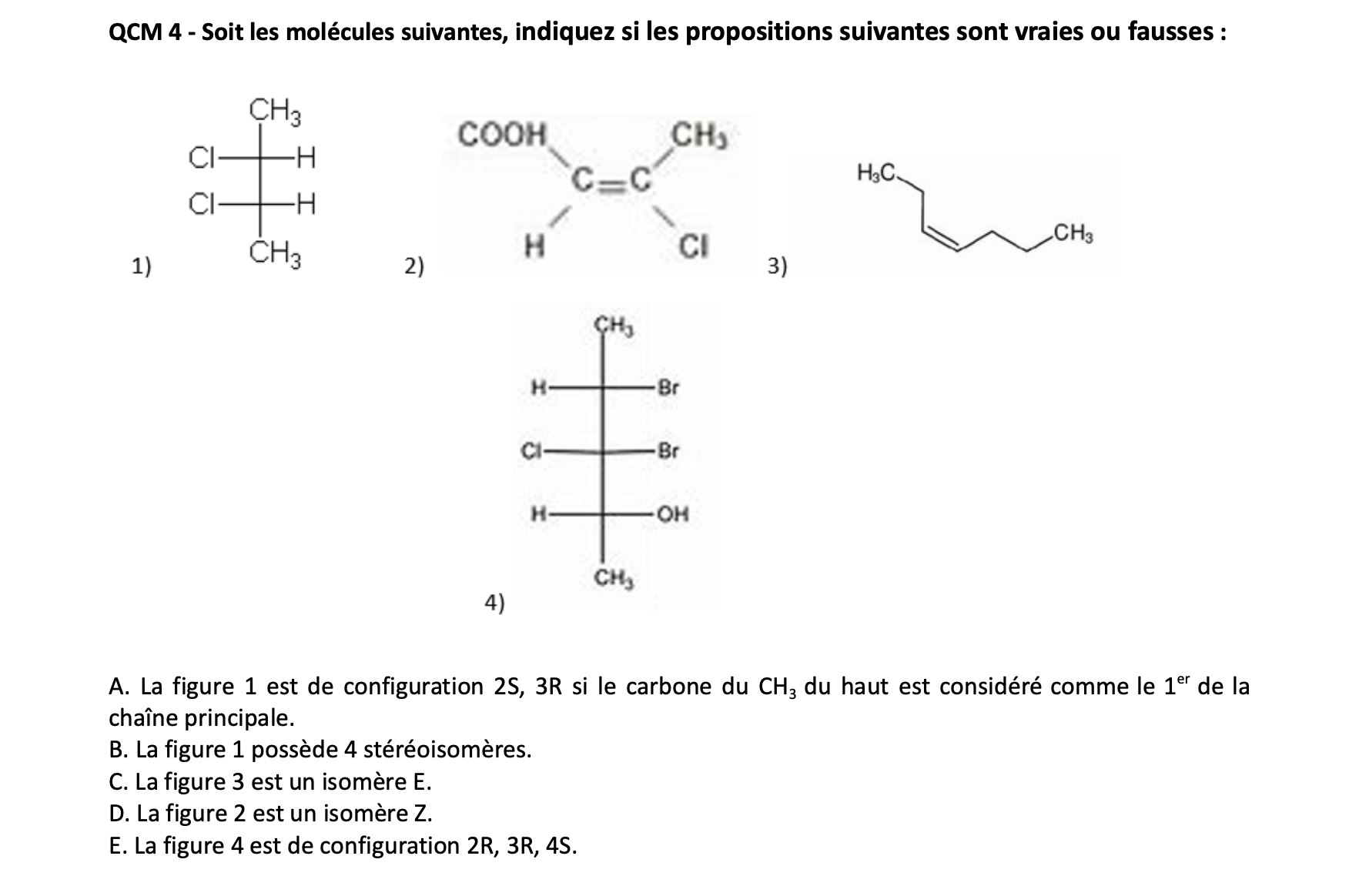 Solution Cicatrix Posted February 16 Solution Posted February 16 (edited) Salut ! Peux-tu m'envoyer la correction stp ? il y a une heure, ethel-luna a dit : Bonjour, je ne comprends pas les items A,B et E de ce QCM, serait-il possible de me les expliquer ? A. Faux car quand on regarde la configuration des carbones on trouve R en haut et S en bas. Il faut classer les substituants entourant le carbone asymétrique par numéro atomique Z décroissant et les numéroter, le 1 étant le substituant ayant le plus grand numéro atomique. Le Cl est prioritaire (n°1), puis en 2 on a le carbone qui porte l'autre Cl. Donc on tourne dans un sens (S pour le 1er C*, en haut), mais vu que le H est devant, on tourne dans l'autre sens (R). On a donc ici 2R, 3S, si on considère que le carbone n°1 est en haut. Schéma : B. Faux, il y a un centre de symétrie donc RS=SR (la configuration 2R3S est la même que 2S3R). Il y a 3 stéréoisomères : RS=SR, RR et SS. E. Tout dépend de qui on considère le Carbone n°1 (et au lieu de t'embrouiller je veux bien me baser sur la correction). Voici ce que je peux déjà déduire de l'item : Dis moi si tu comprends mieux et n'hésite pas à reposer des questions sinon ! Edited February 16 by Cicatrix lauranou 1 Quote