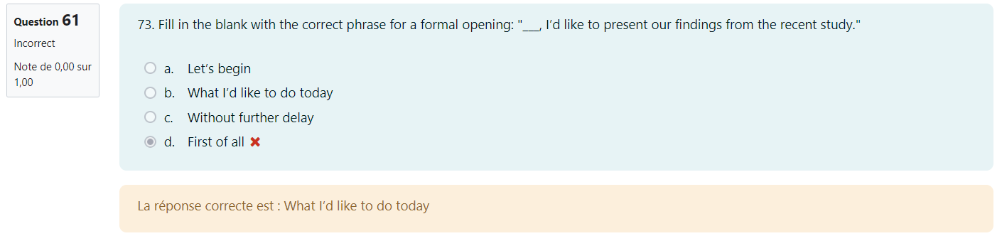 Solution Nth56 Posted February 18 Solution Posted February 18 Il y a 1 heure, PauliNébuline a dit : Salut! 1ère question : Il nous donne l'énoncé suivant : 42. Fill in the blank for managing audience questions: "___ to save all questions for the end of the presentation." avec les possibilités : Please / I'd like to / Feel free / Let's La correction dit que c'est please la bonne réponse. Ca me semble vraiment bizarre de dire "please to"... 2ème question : C'est pas bizarre de répéter "I'd like to"? Merci! Pour la premiere question, la correction veut rien dire donc y a surement une erreur, ça serait plus feel free ou i’d like to. Pour la deuxieme c’est pareil la correction on dirait que en gros il se pose la question de ce qu’il voudrait faire et la suite de la phrase repond mais ducoup c’est pas logique de mettre tout la meme phrase avec qu’une virgule entre les deux En vrai ces qcms sur moodle sont truffés de fautes je pense donc t’y attardes pas trop et doutes pas trop de tes reponses sur des corrections comme ça. Je te conseille surtout de faire les annales des dernieres années avec les rattrapages, c’est les seuls où tu peux etre a peu pres sûr de la correction et c’est le mieux pour l’exam chADN, PASScalLeGrandFrère and sofiaspirine 1 2 Quote