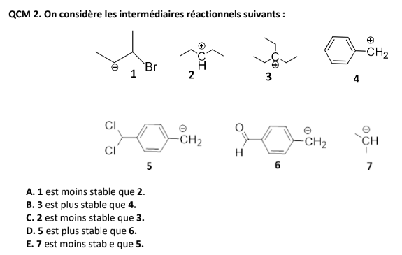 Solution kècecé Posted February 24 Solution Posted February 24 Salut ! Pour la C, tu es dans le cas des carbocations : ils sont stabilisés par des effets donneurs d'électrons (I+,M+), les groupements CH2-CH3 (les chaines carbonées en général) ont un effet I+ donc plus il y a de groupements donneurs, plus le carbocation sera stabilisé : - Molécule 2 : 2 groupements CH2-CH3 donc 2 I+ - Molécule 3 : 3 groupements CH2-CH3 donc 3 I+ La molécule 2 à moins d'effets donneur que la molécule 3 donc la 2 est moins stable que la 3. Pour la E, ici c'est un carbanion, ils sont stabilisés par des effets I- et M- (attracteurs), sur la molécule 7, on voit deux groupements CH3 donc 2 I+, du coup c'est encore moins stable alors que sur la 5 tu as un cycle où les électrons peuvent être délocalisé (il a un effet M-). J'espère que ça pourra t'aider, n'hésites pas si tu as d'autres questions, Bon courage lysopaïne, Bastitine and Laketsialogie 1 1 1 Quote